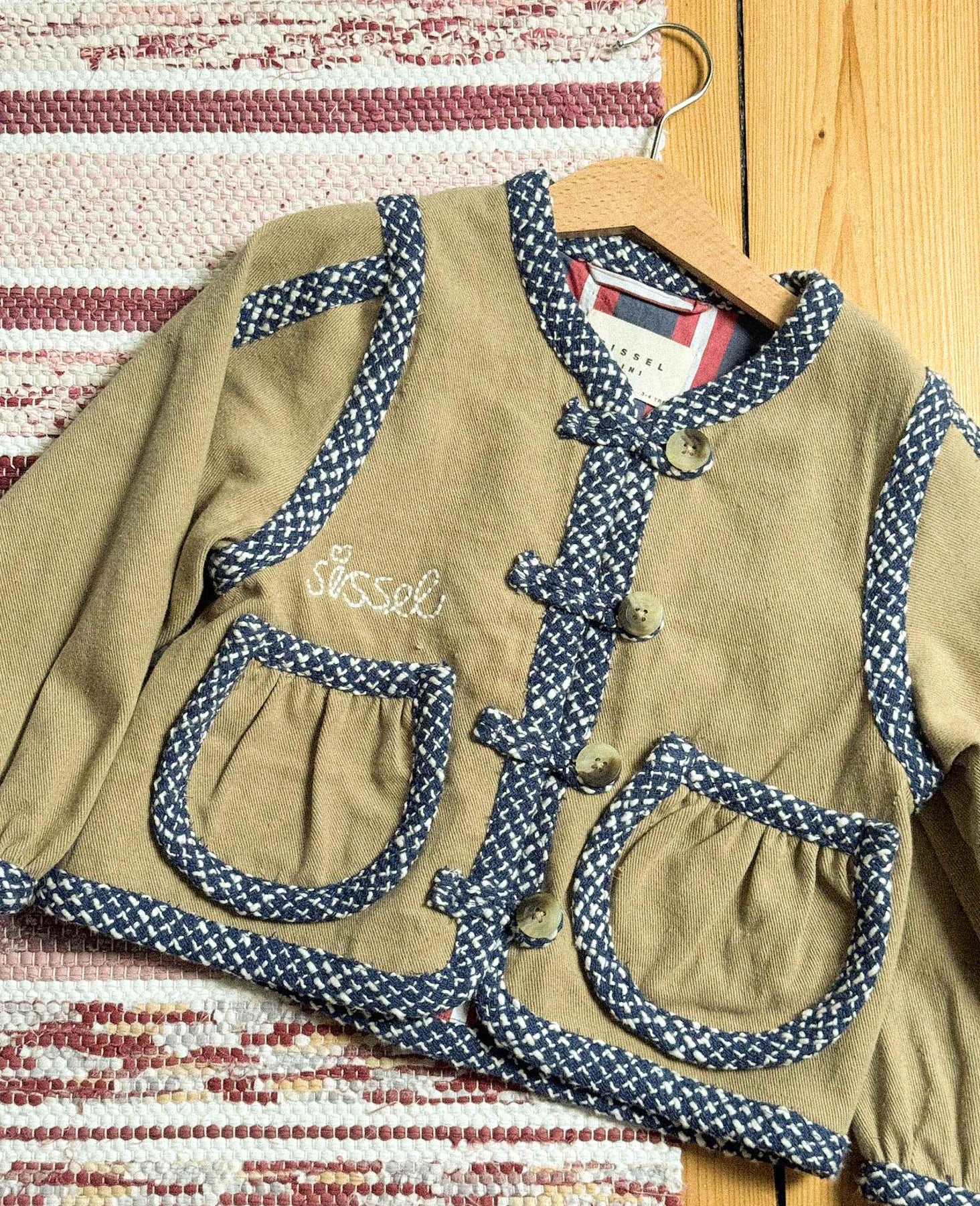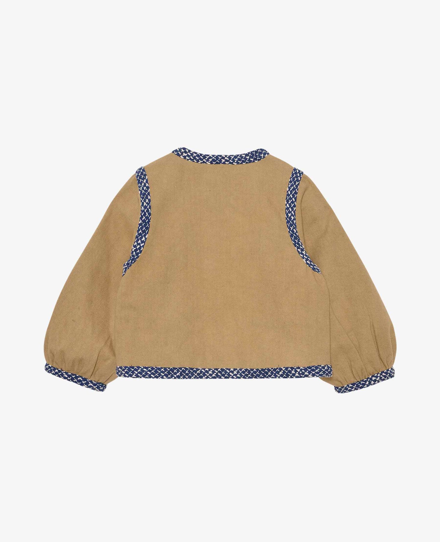 En sandfarget jakke fra Sissel Edelbo med blå og hvitmønstrede kantbånd. Jakken har broderi og dekorative sømmer.