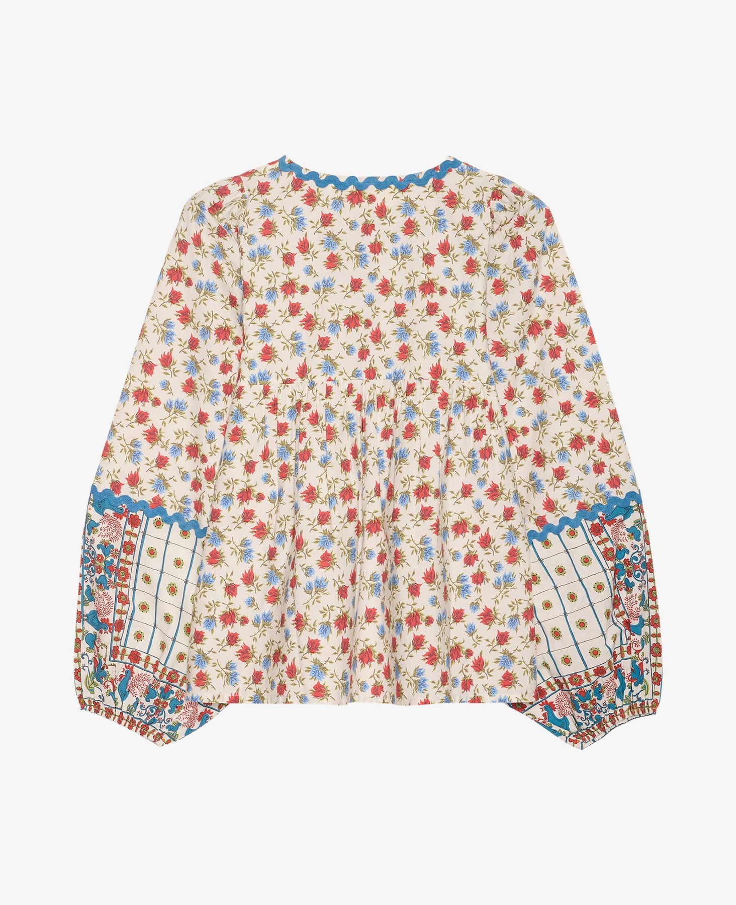 Topp fra Sissel Edelbo med flerfarget blomsterprint i røde og blå nyanser på en kremhvit base. Toppen passer både til hverdagsbruk og festlige anledninger.