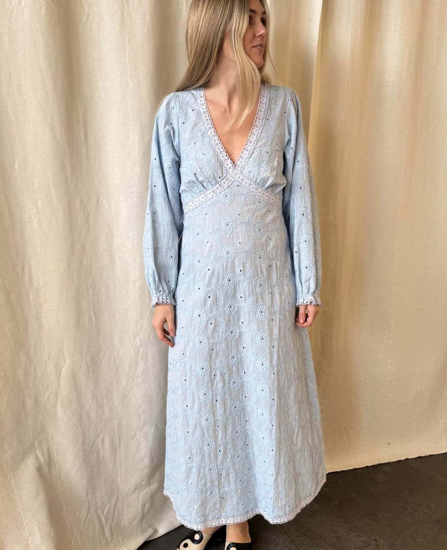 Lyseblå kjole fra Sissel Edelbo, laget av schiffli-bomull. Kjolen har broderte blomsterdetaljer over hele stoffet og blonder ved utringningen og kantene.