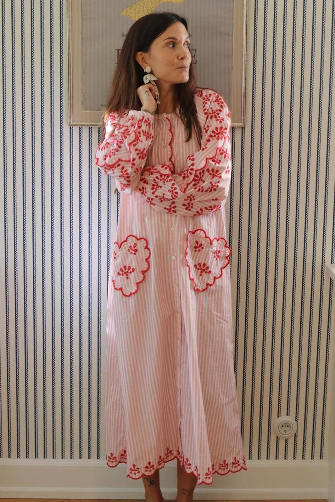 Stripet kjole fra Sissel Edelbo i rødt og hvitt. Kjolen er laget av 100 % økologisk bomull med broderi og dekorative sømmer.