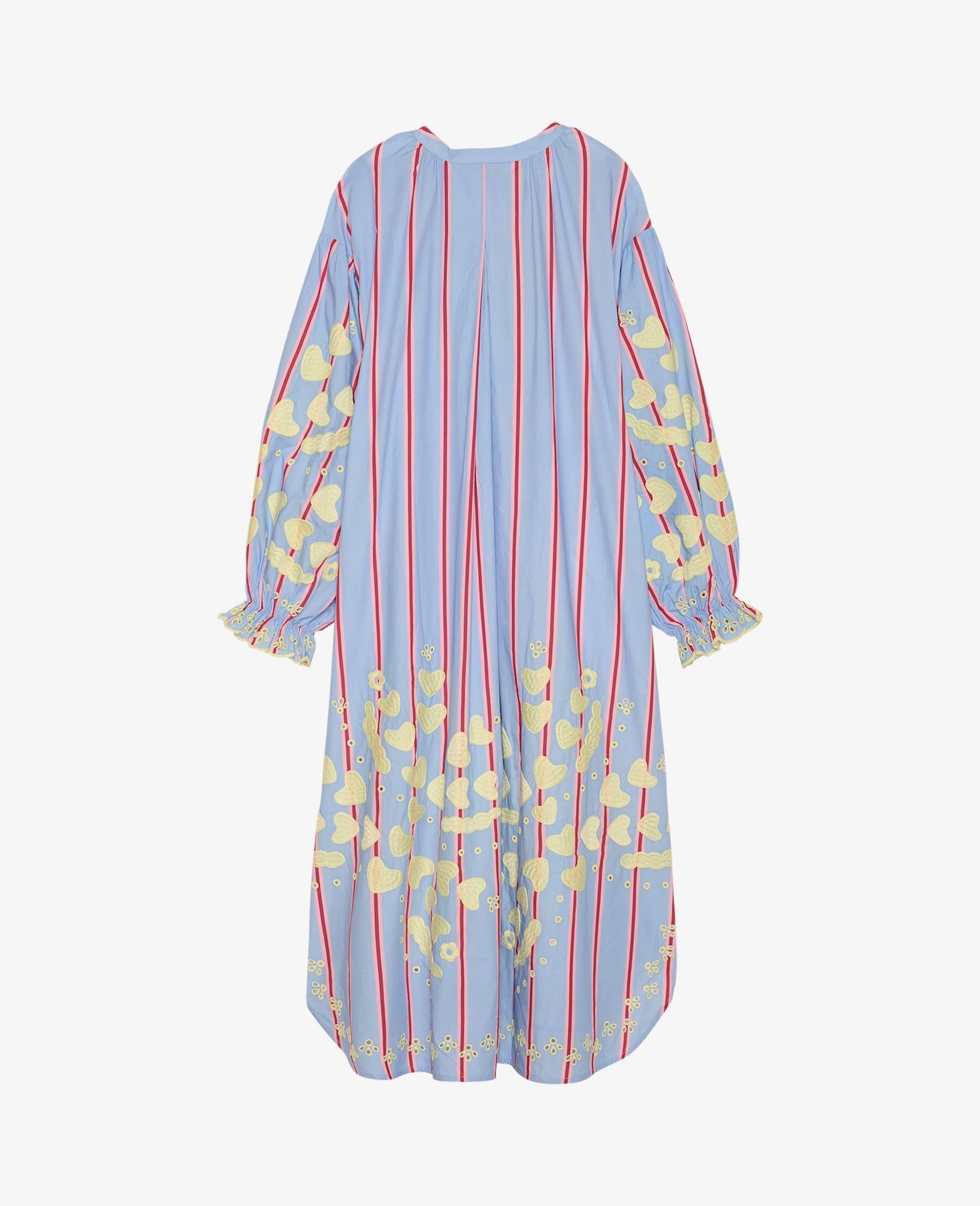 Kjole fra Sissel Edelbo med lyseblå bakgrunn og røde vertikale striper. Kjolen har broderte lysegrønne hjerter og blomster på forsiden, ermene og den nederste delen.