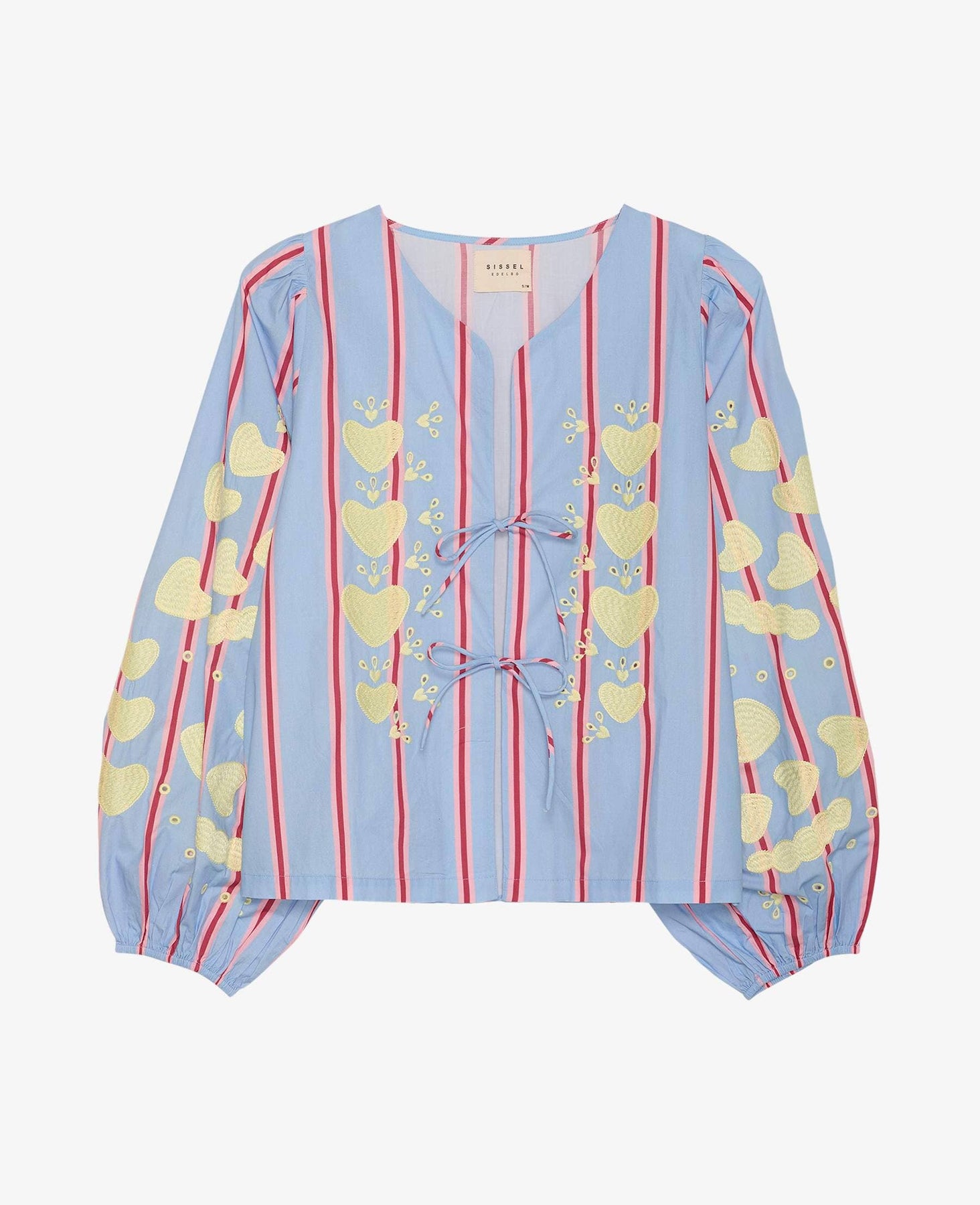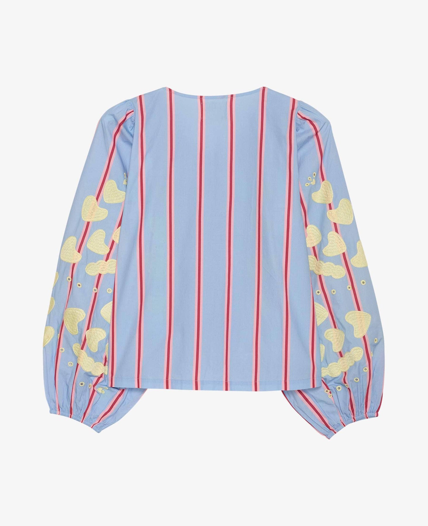 Lys blå topp fra Sissel Edelbo med røde striper og grønne hjertebroderier. Toppen er laget av 100 % økologisk bomullspoplin med åpen front.