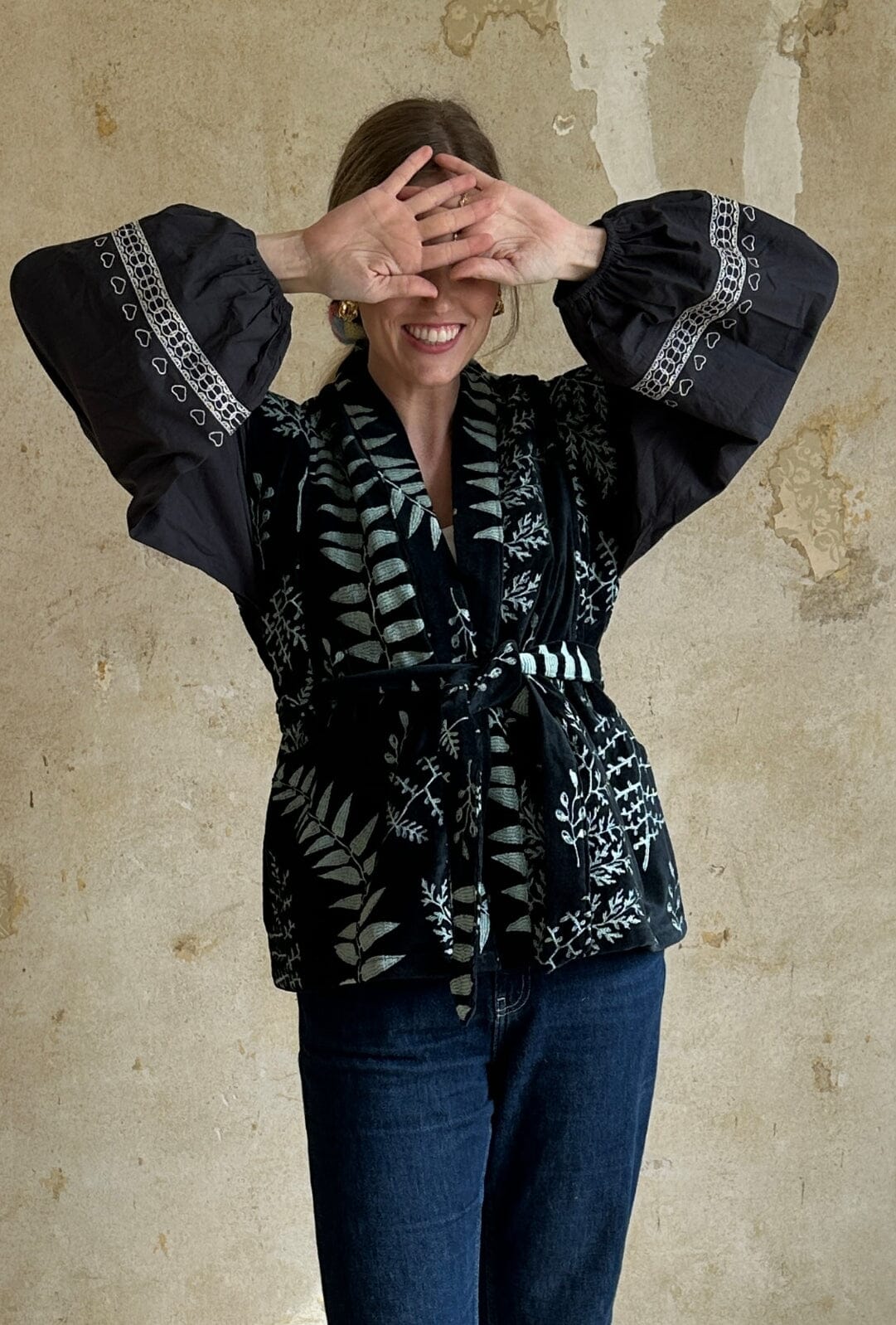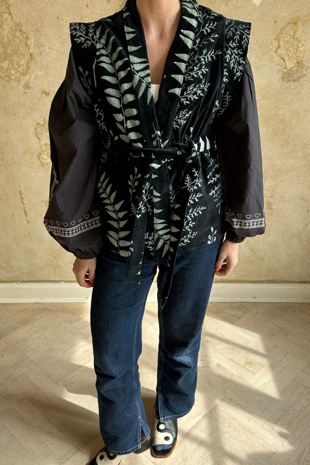 Mørk vest fra Sissel Edelbo i økologisk bomull med broderte blader. Den har brede skuldre, sidelommer og et avtagbart belte. Fôret innvendig med håndlaget bloktrykk.