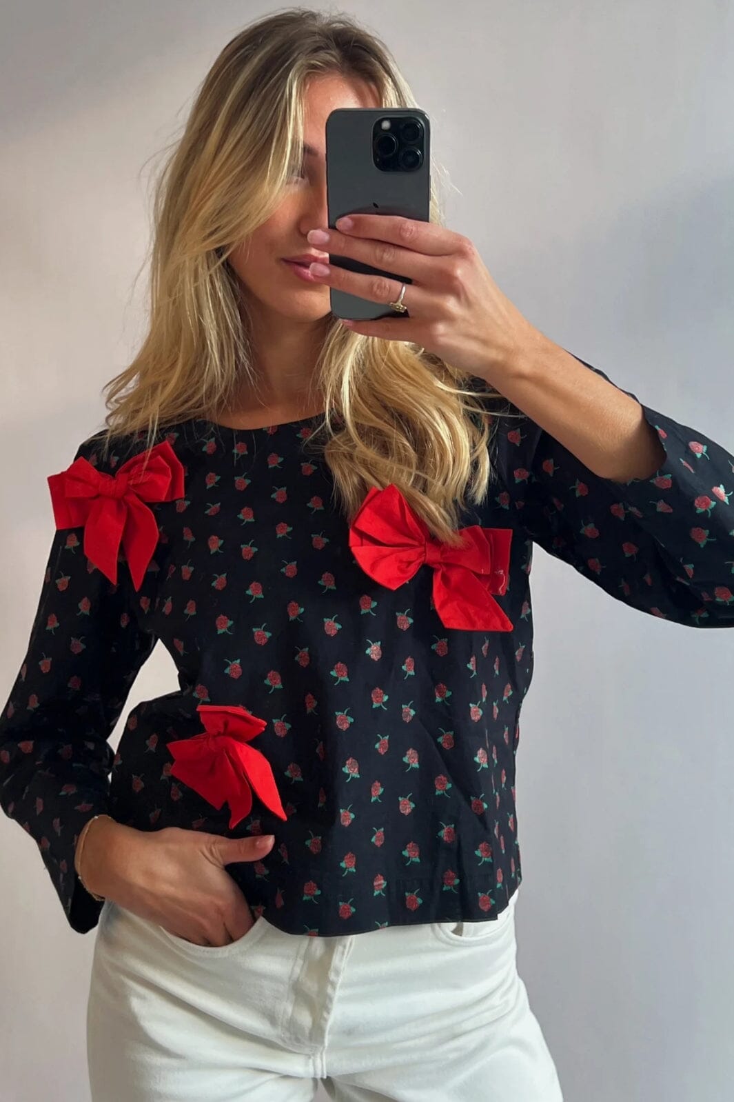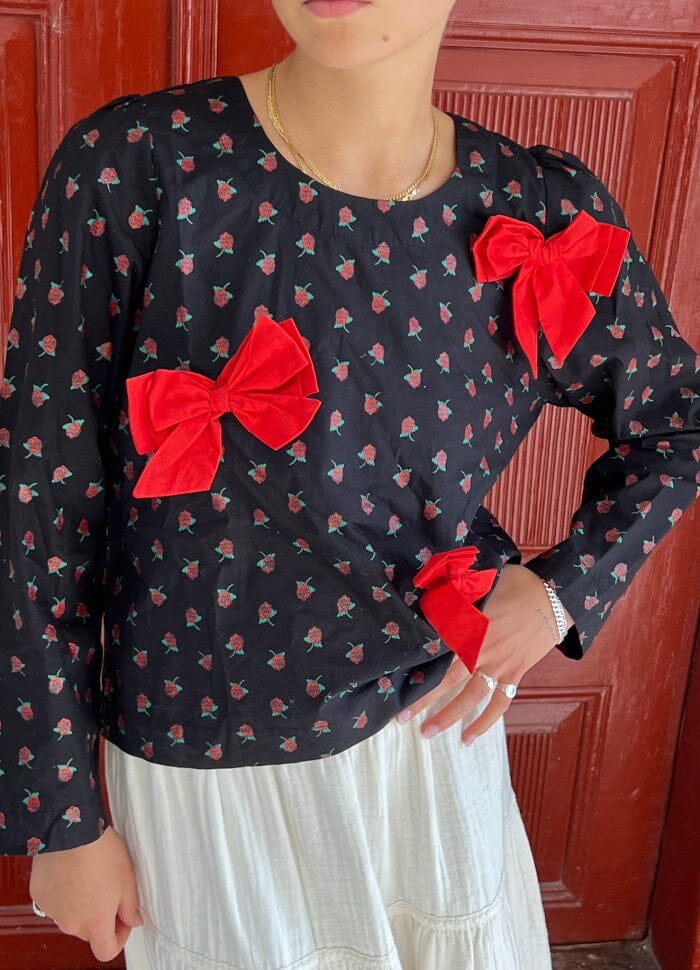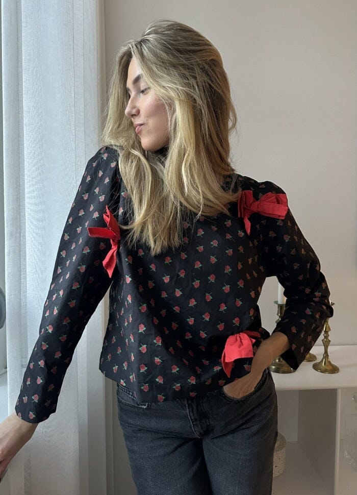 Svart topp fra Sissel Edelbo med røde roser og dekorative sløyfer. Toppen er laget av økologisk bomullspoplin med lange ermer og rund halsutskjæring. Den knytes i nakken med en sløyfe.