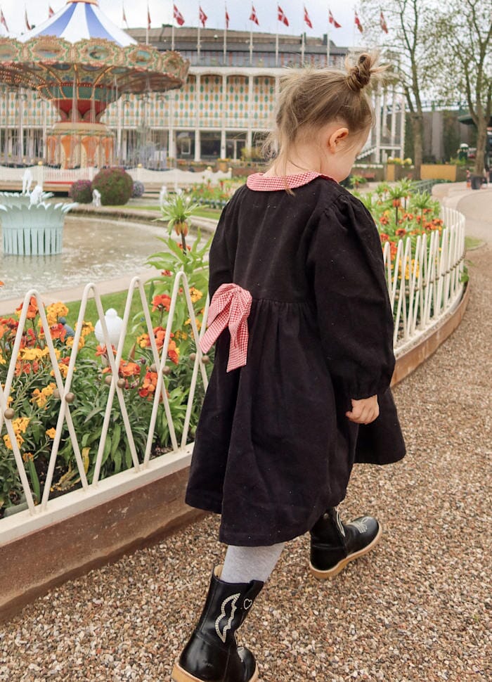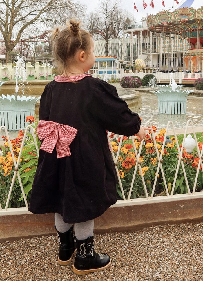 Kjolen er laget av overskuddsfløyel med sjarmerende rød-og-hvit rutete detaljer på kragen, lommene og sløyfen, og er ferdigstilt med vakkert broderte svaner på lommene.