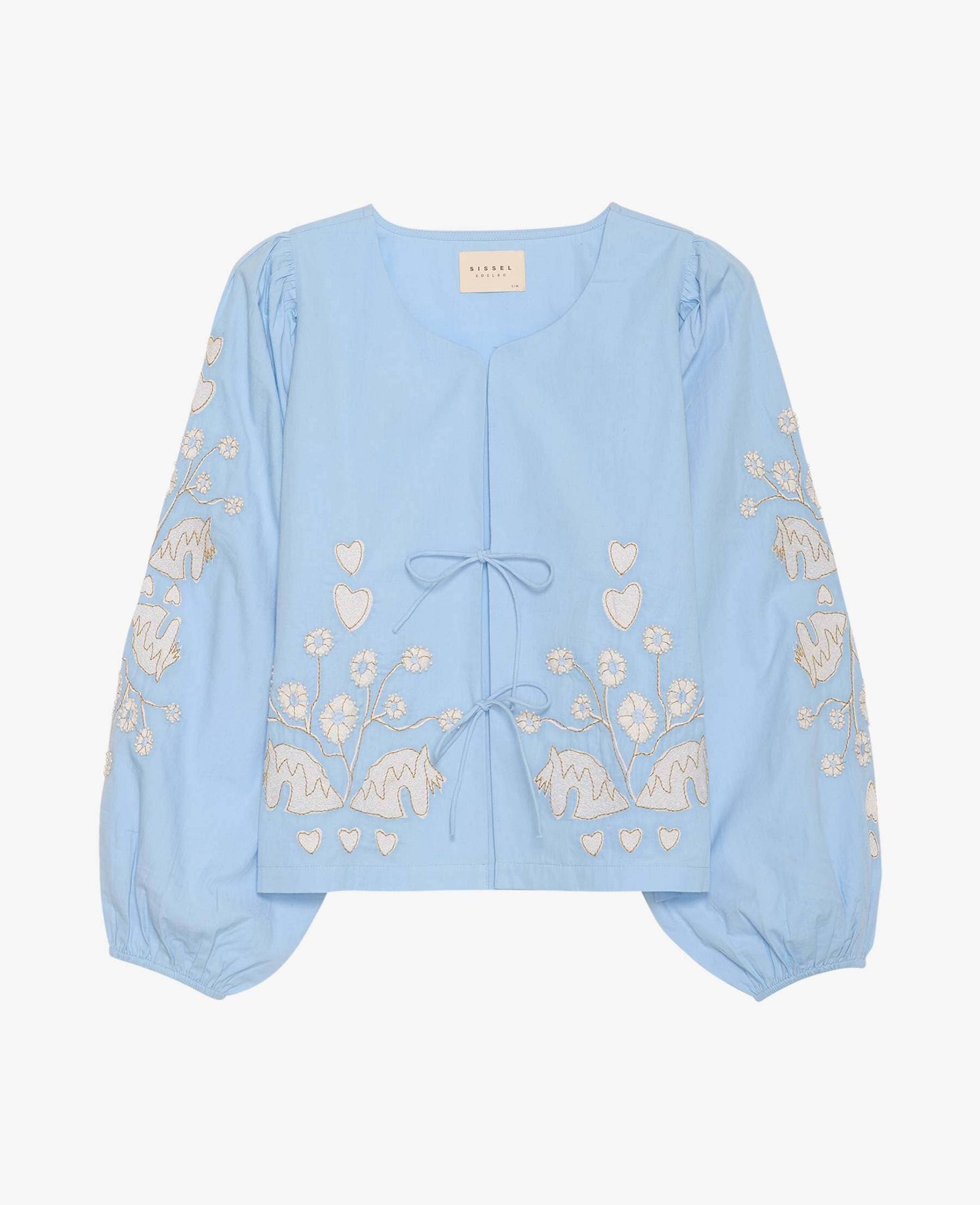 Lys blå topp fra Sissel Edelbo med broderte hjerter og blomster på fronten og ermene. Toppen har knytedetaljer foran og perledekorasjoner.