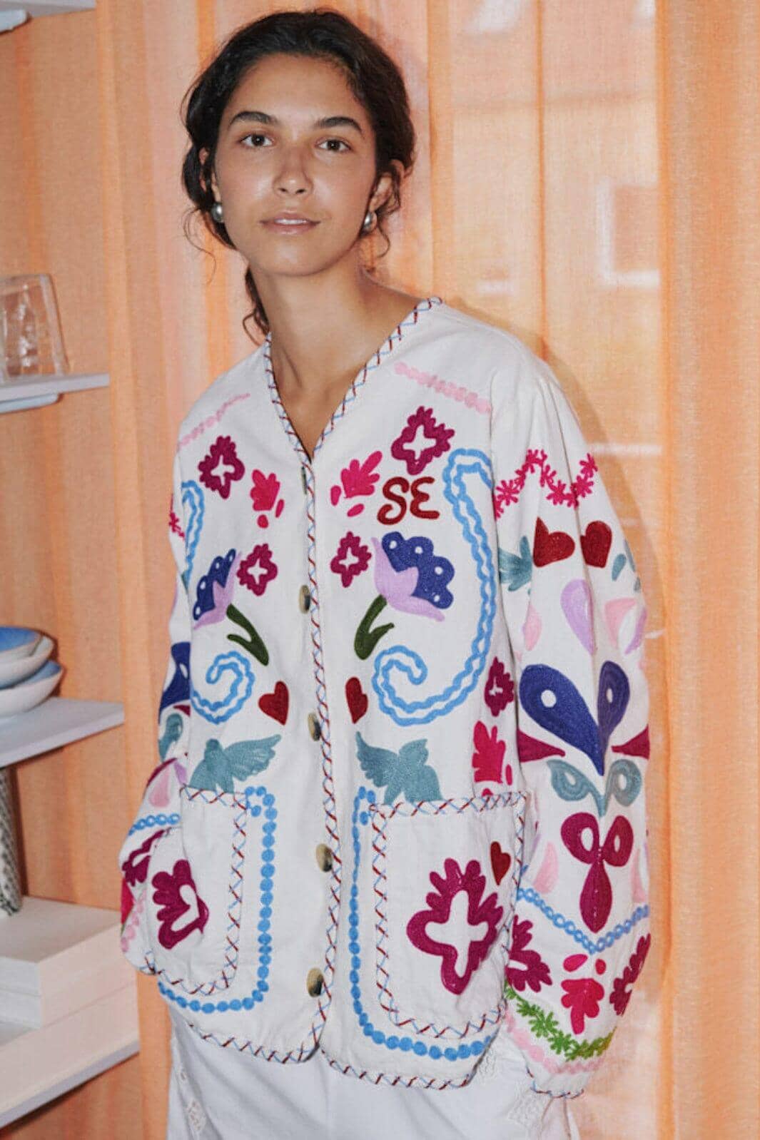 Jakke fra Sissel Edelbo i kremfarget bomullslærred med fargerik Suzani-broderi. Broderiet viser blomster, små hjerter og en fredsdue.