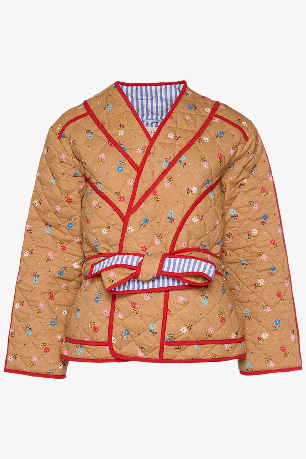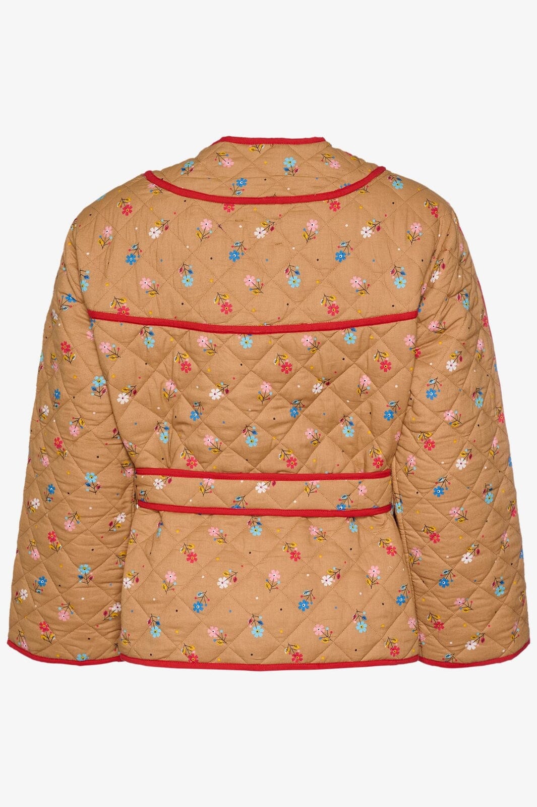 Quiltet jakke fra Sissel Edelbo i beige med blomstermønster. Jakken har røde kantbånd langs kanterne og et aftageligt belte. Den quiltede sømmen skaper et dekorativt mønster på stoffet.