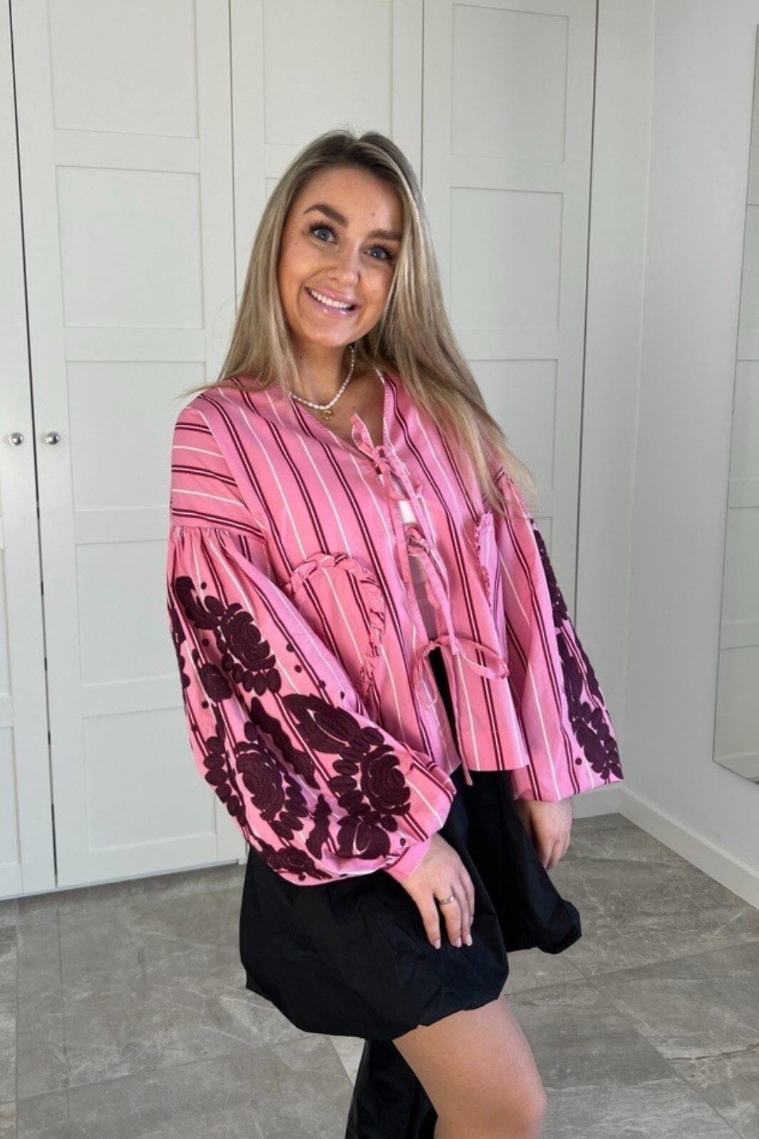 Stripet topp fra Sissel Edelbo i økologisk bomull. Den rosa toppen har bordeauxfargede blomstermønstre på ermene og tre sett med snorer foran.