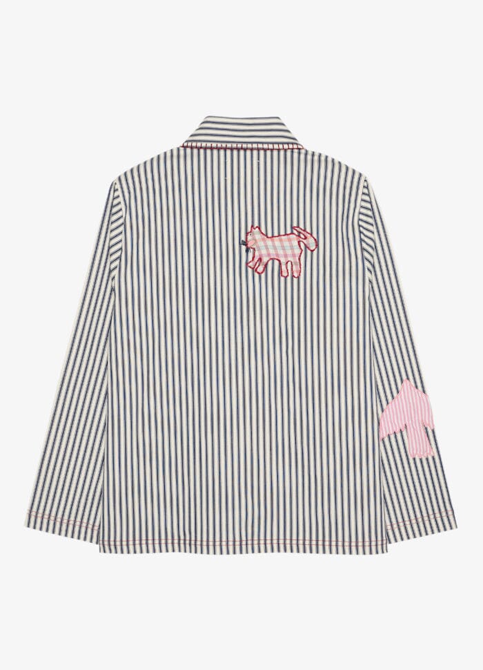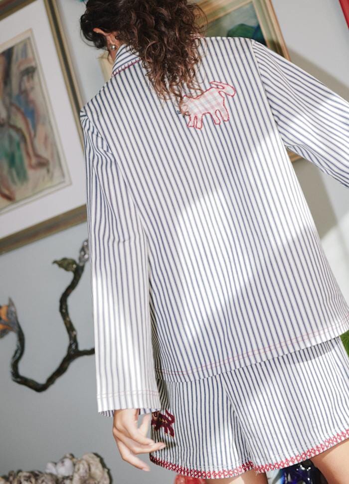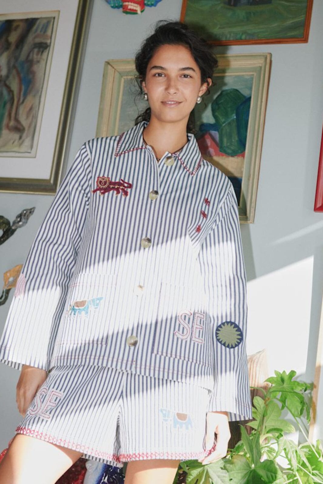 Stripet jakke fra Sissel Edelbo med broderte motiver som sol, tiger og hest. Jakken er laget av overskuddsbomullslærred med 3 % stretch.