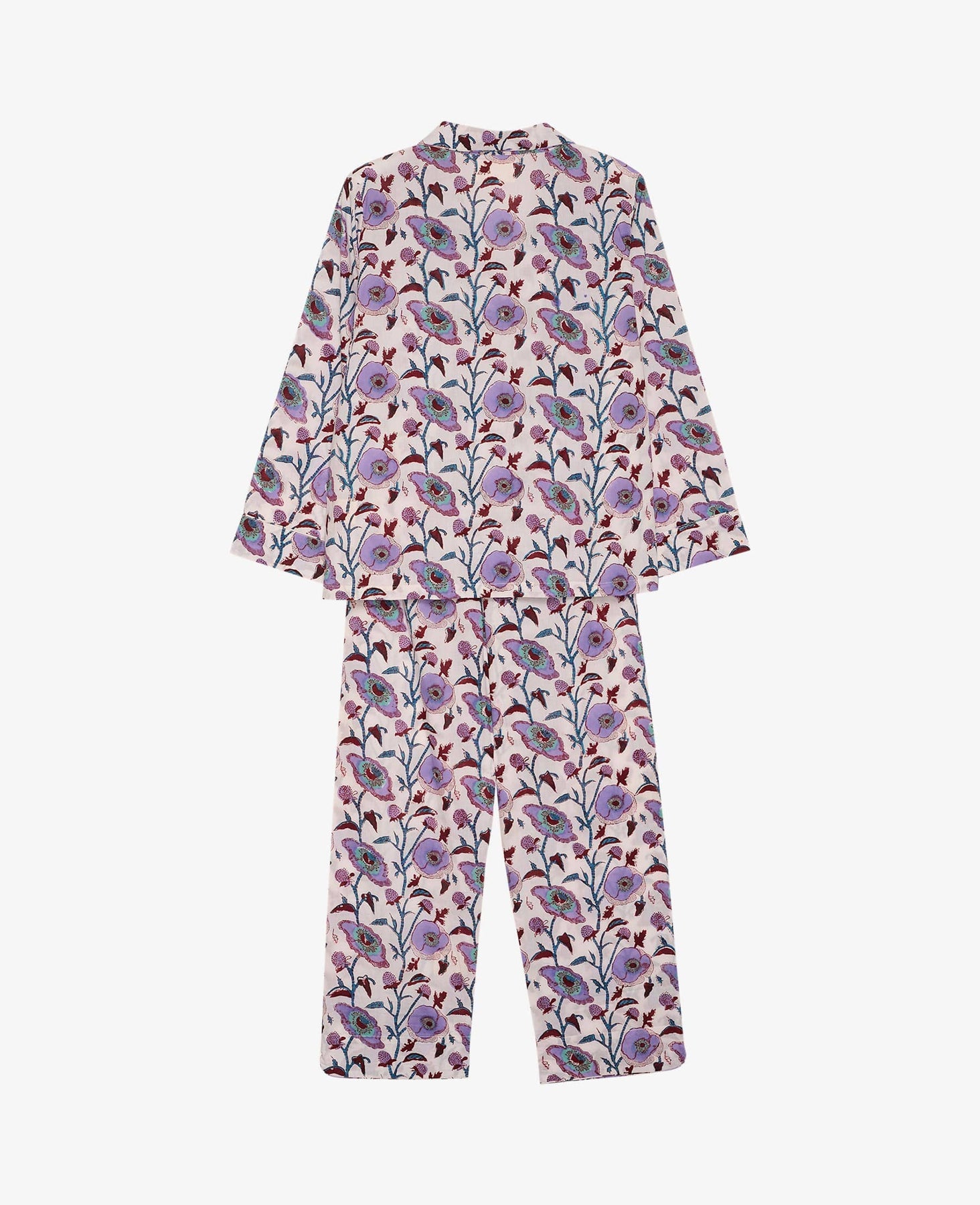 Pyjamassett fra Sissel Edelbo med lilla blomstermønster. Sett laget av 100 % økologisk bomull og utsmykket med tradisjonelle indiske blokktrykk.