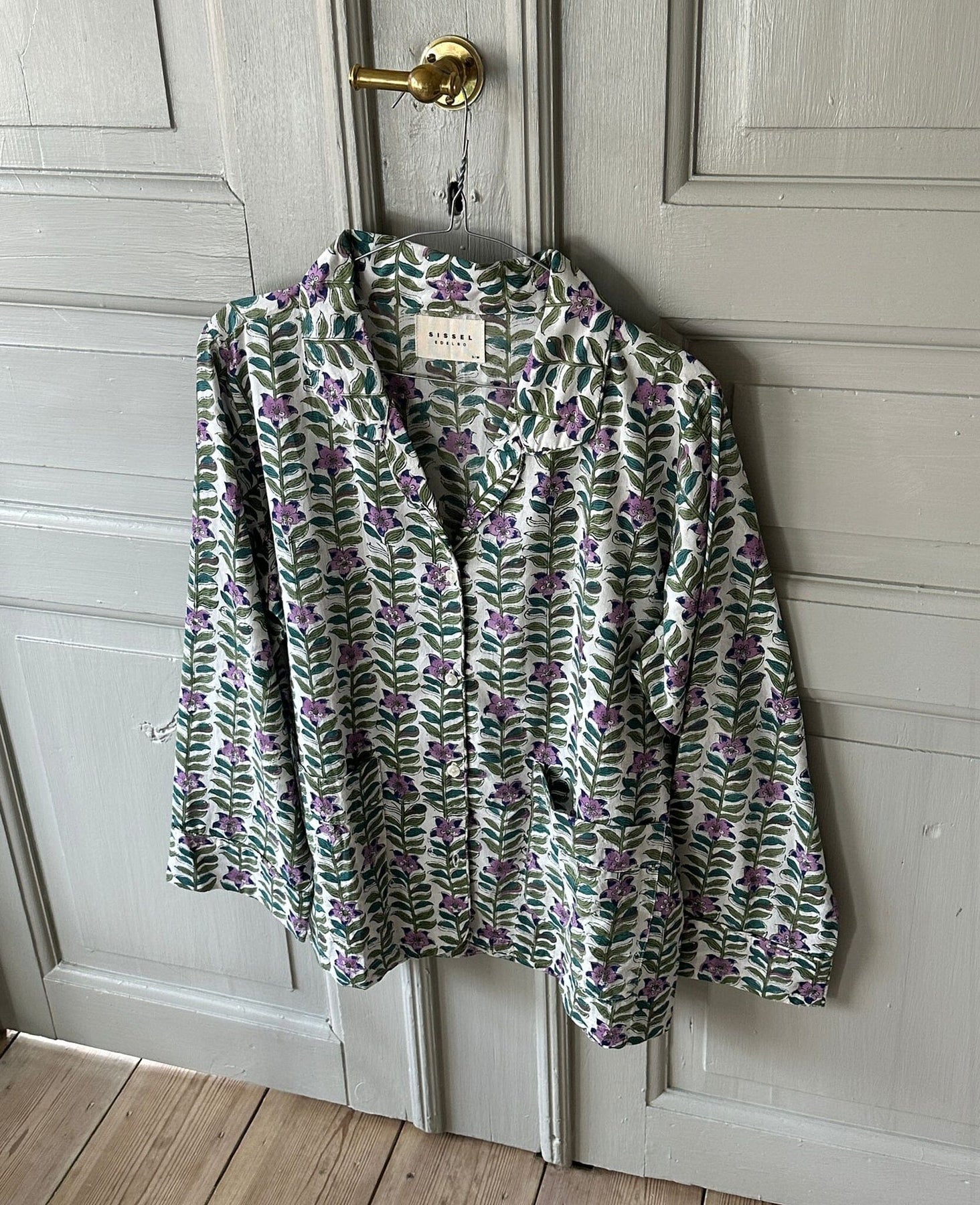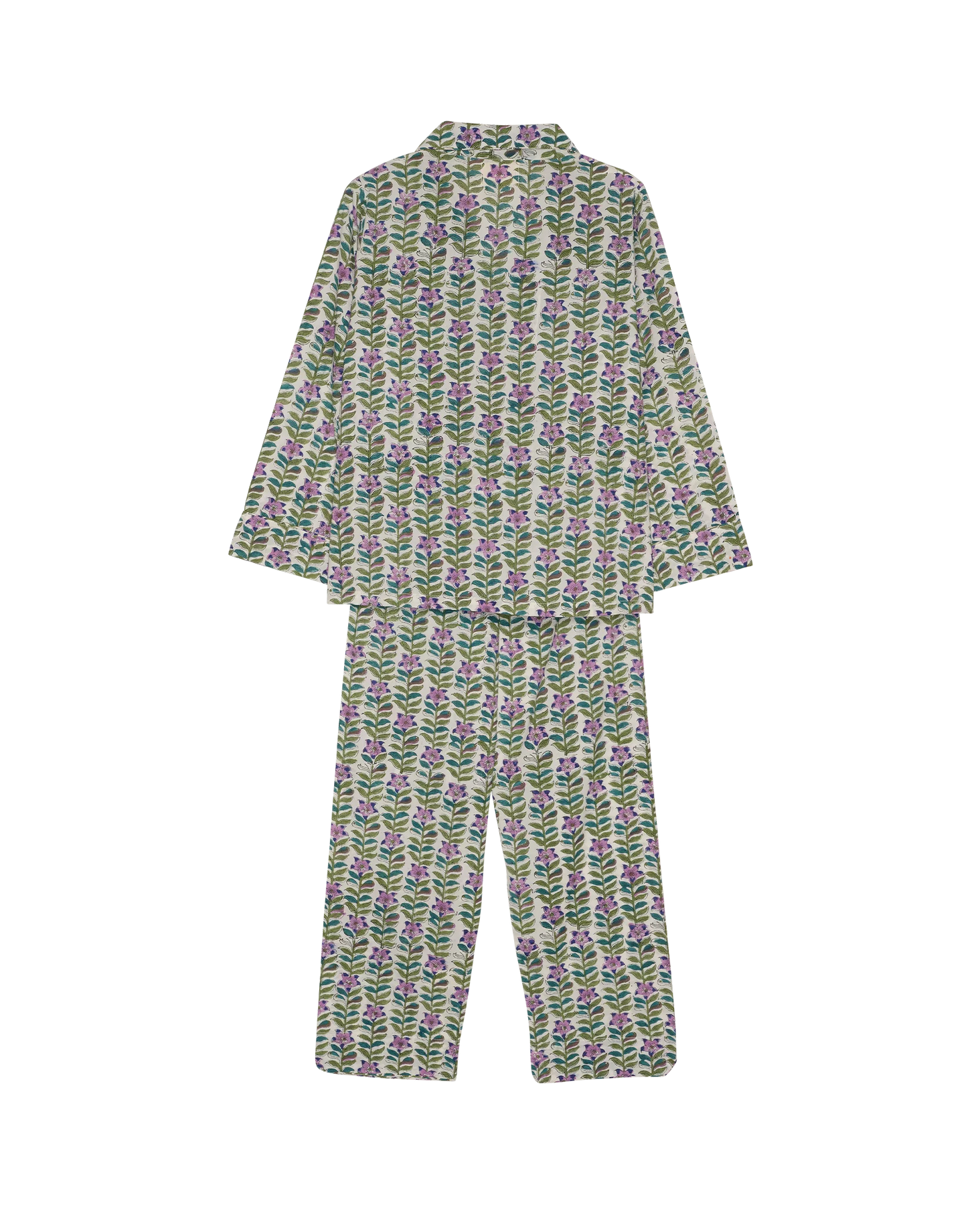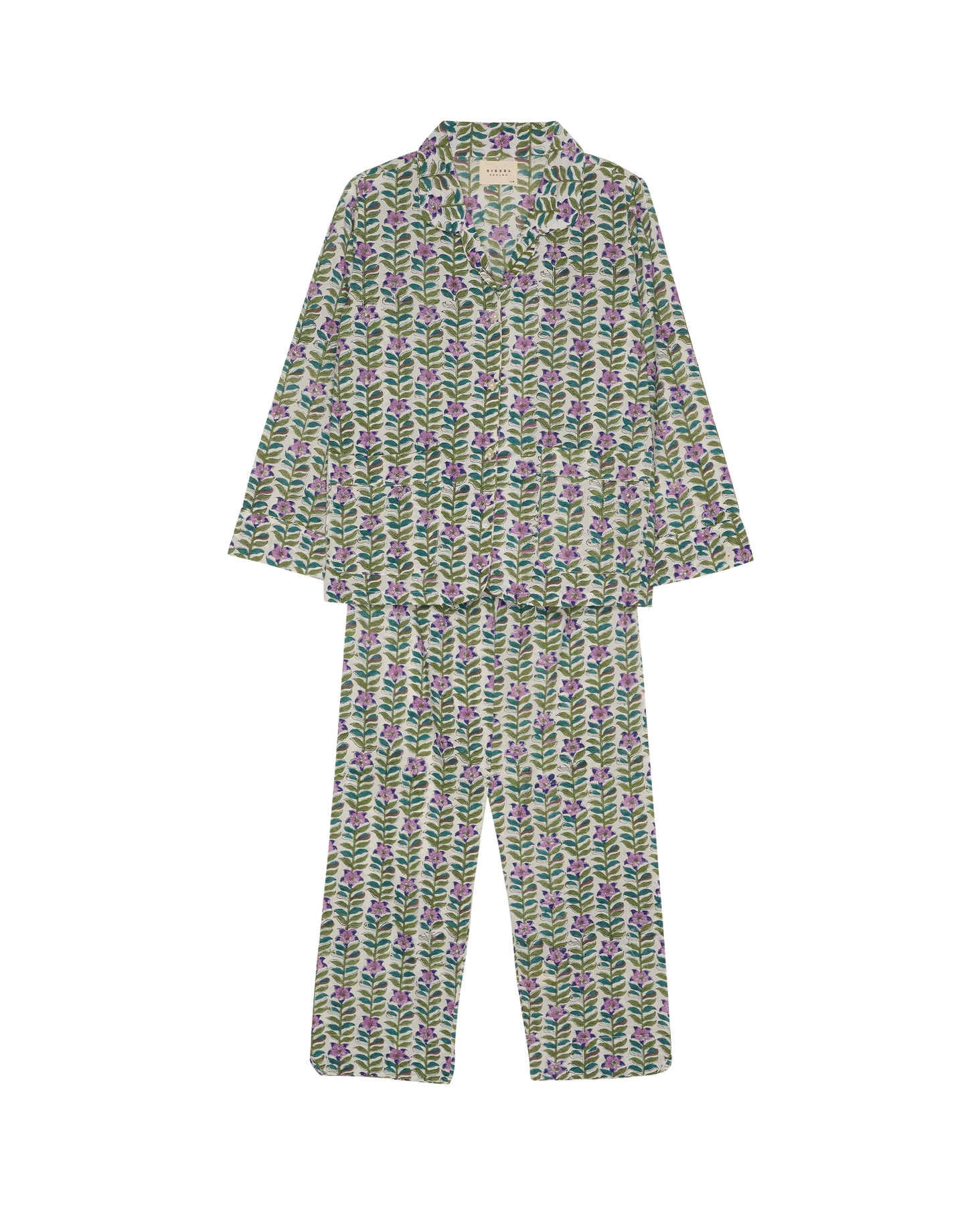 Pyjamas sett fra Sissel Edelbo med mønster av lilla blomster og grønne blader. Sett består av en langermet skjorte med krage og matchende bukser.
