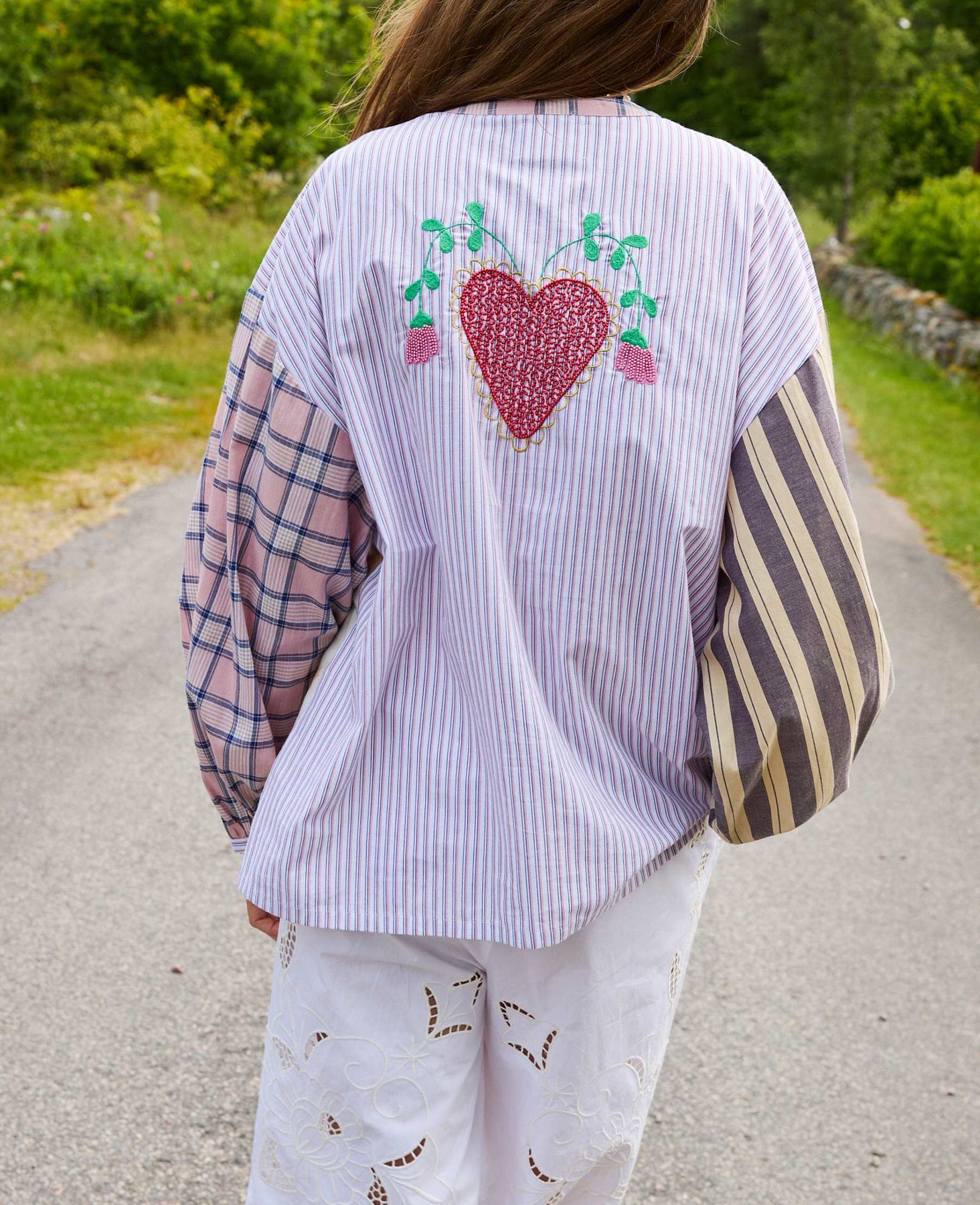 Skjorte fra Sissel Edelbo med et flerfarget patchwork-design i ruter, striper og blomstertrykk. Skjorten har perlemorsknapper og et brodert hjerte på ryggen.