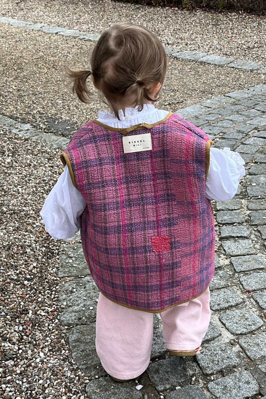 Quiltet vest fra Sissel Edelbo med rosa og lilla rutete mønster. Vesten har en rund halsutskjæring og er laget med dekorativ søm som gir en karakteristisk quiltet tekstur.
