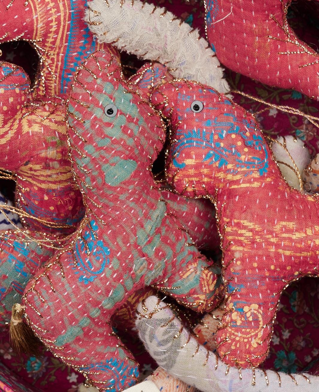 Gyngehest-ornament fra Sissel Edelbo, laget av rester fra kantha-tepper med gullfarget lurex-søm. Ornamentet har en rød kropp med blå mønstre.