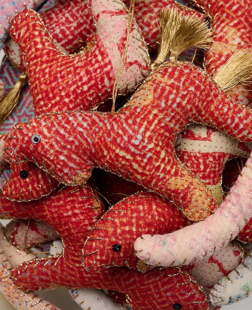 Gyngehest-ornament fra Sissel Edelbo, laget av rester fra kantha-tepper. Ornamentet har et rødt og hvitt mønster med en gylden dusk som hale.