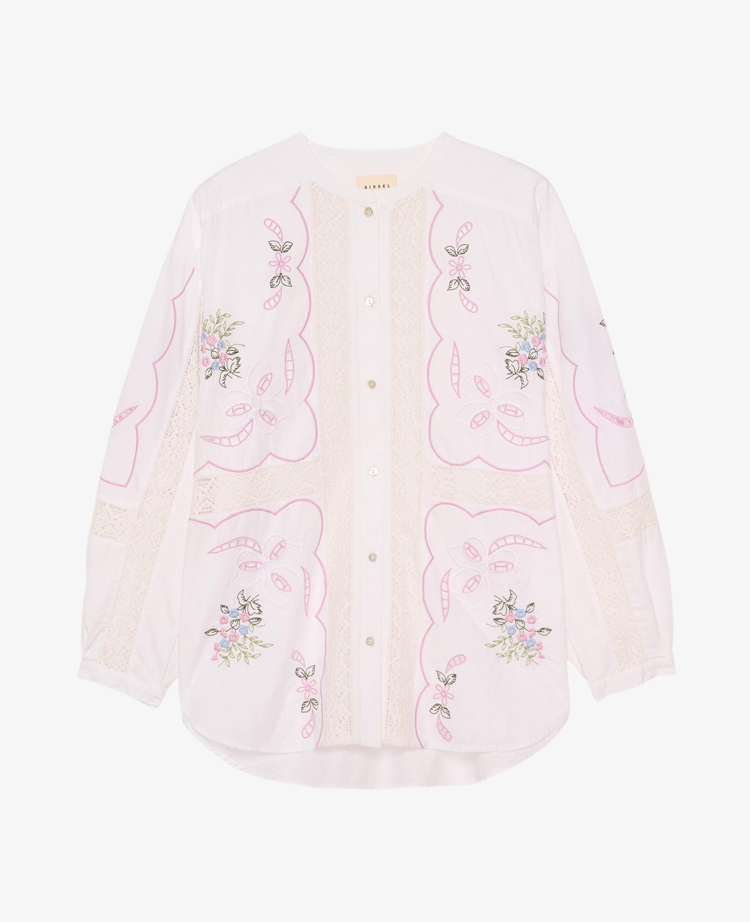 Hvit skjorte fra Sissel Edelbo med broderte blomstermotiver i pastellfarger og blondedetaljer. Skjorten har en løs passform og er laget av økologisk bomull.