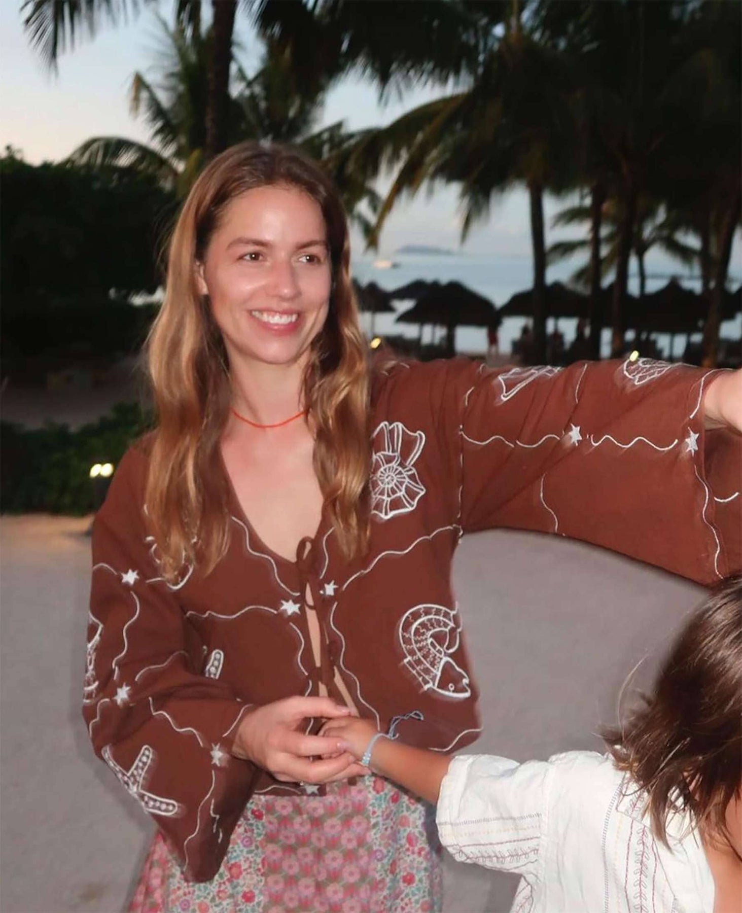Brun topp fra Sissel Edelbo i økologisk bomull. Toppen har hvite broderier av skjell, stjerner og fisk. Den kommer med V-utringning og to sett snorer foran.