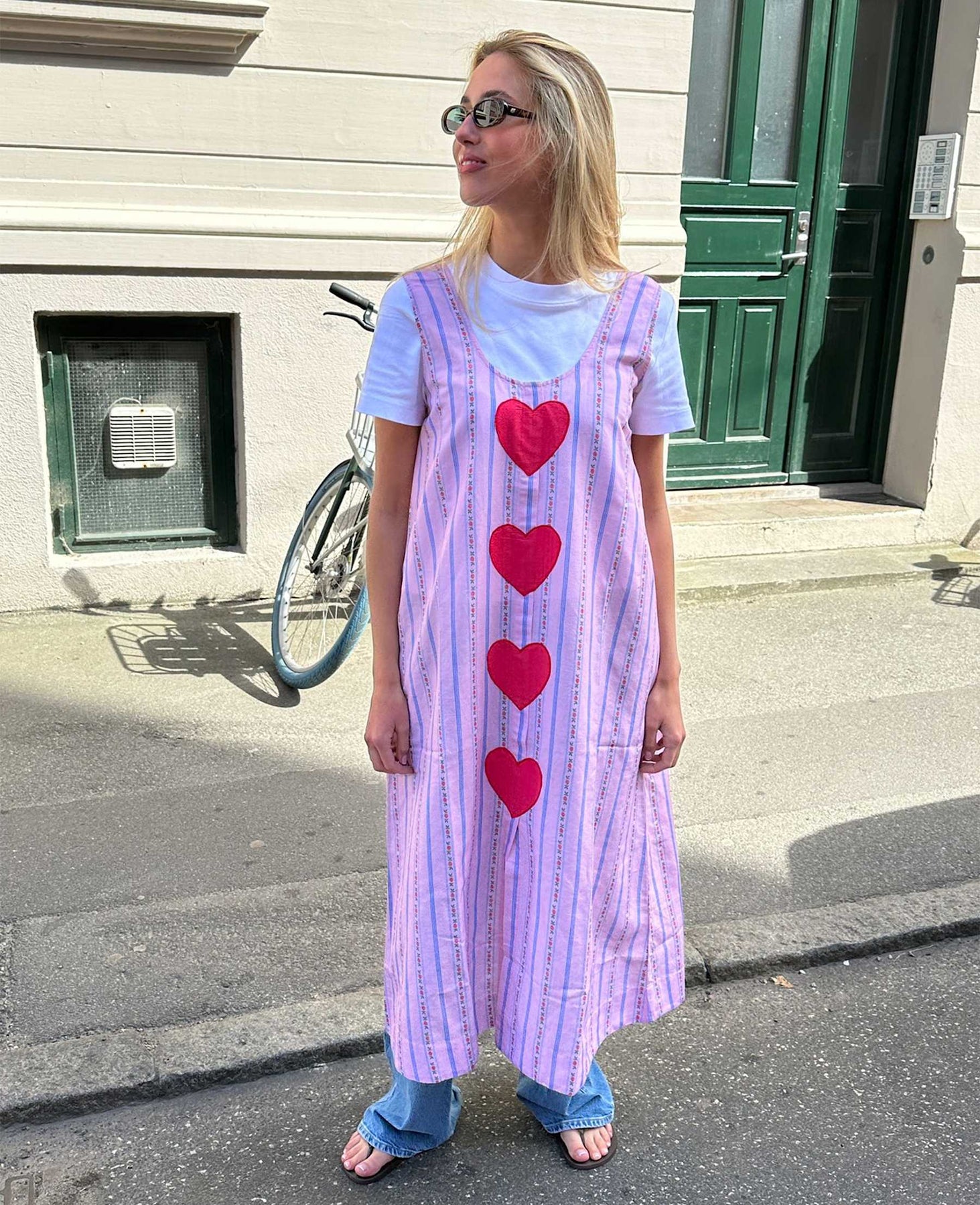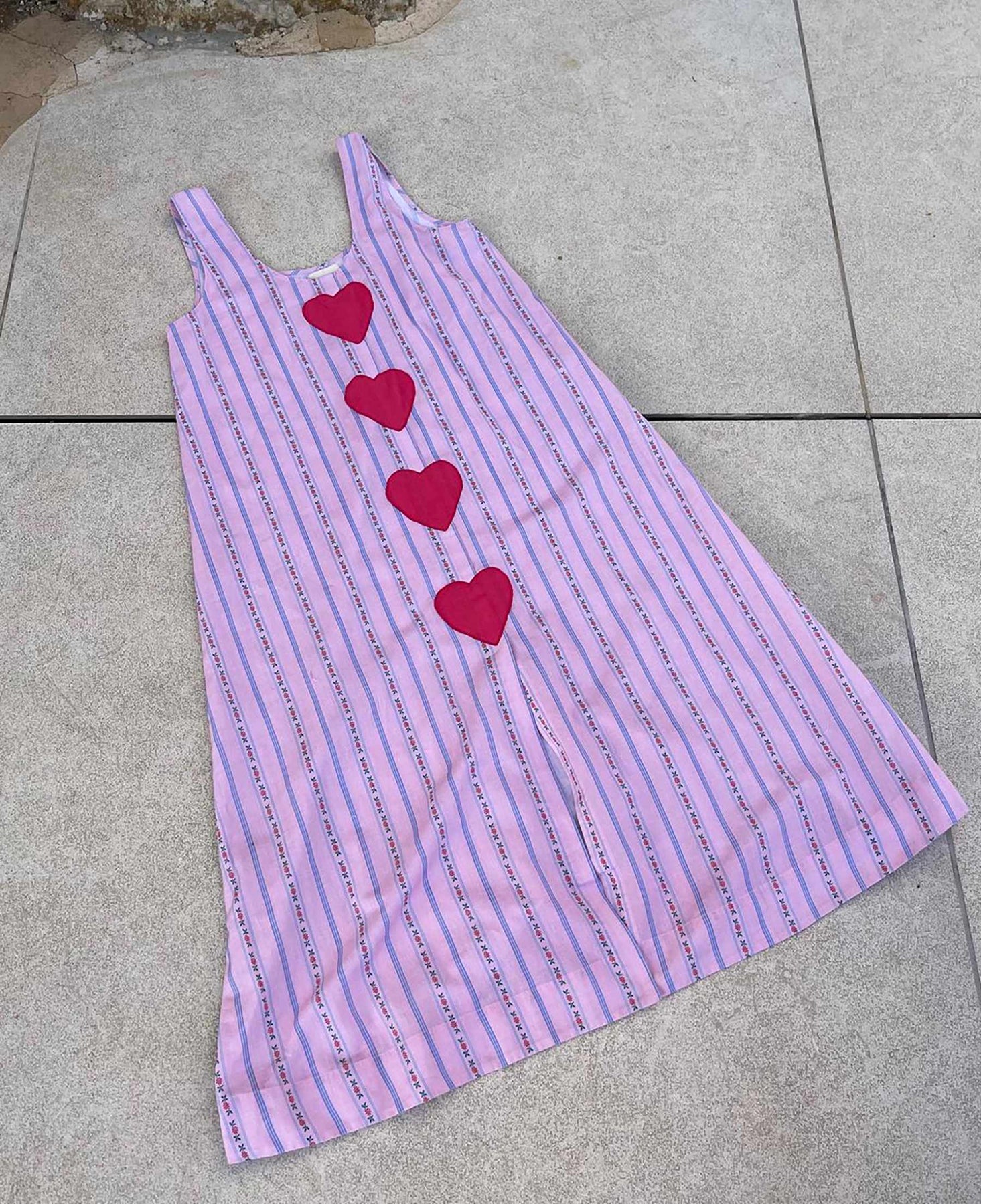 Lang kjole i vintage rose med stripemønster og blomsterdetaljer. Den løse modellen har rund halsutskjæring og fire store hjerteapplikasjoner på forsiden.