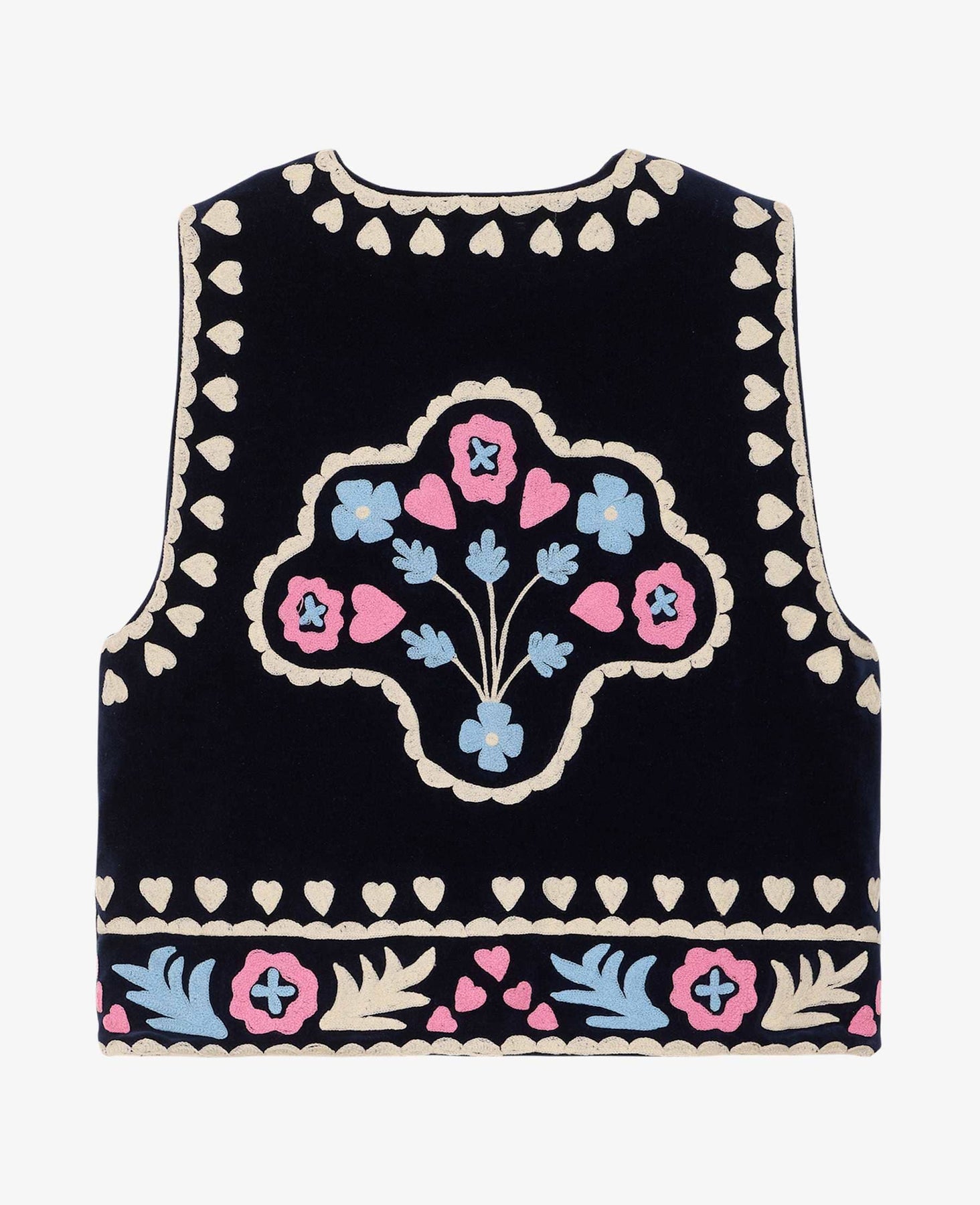Mørkeblå vest fra Sissel Edelbo med Suzani-broderi i blomsterdesign. Laget av overskuddsvelourbomull og fôret med stripet bomull.
