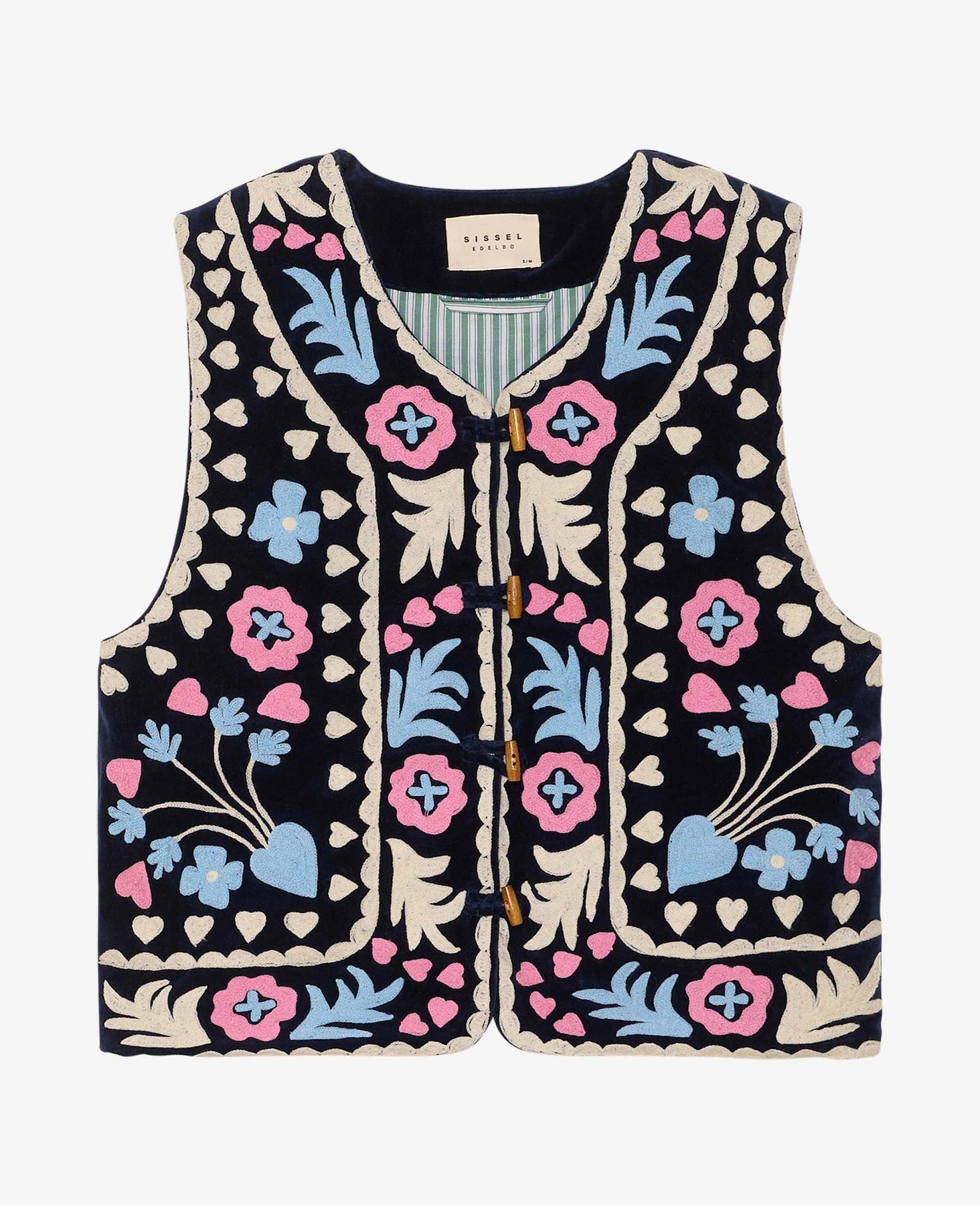 Mørkeblå vest fra Sissel Edelbo med Suzani-broderi i blomsterdesign. Laget av overskuddsvelourbomull og fôret med stripet bomull.