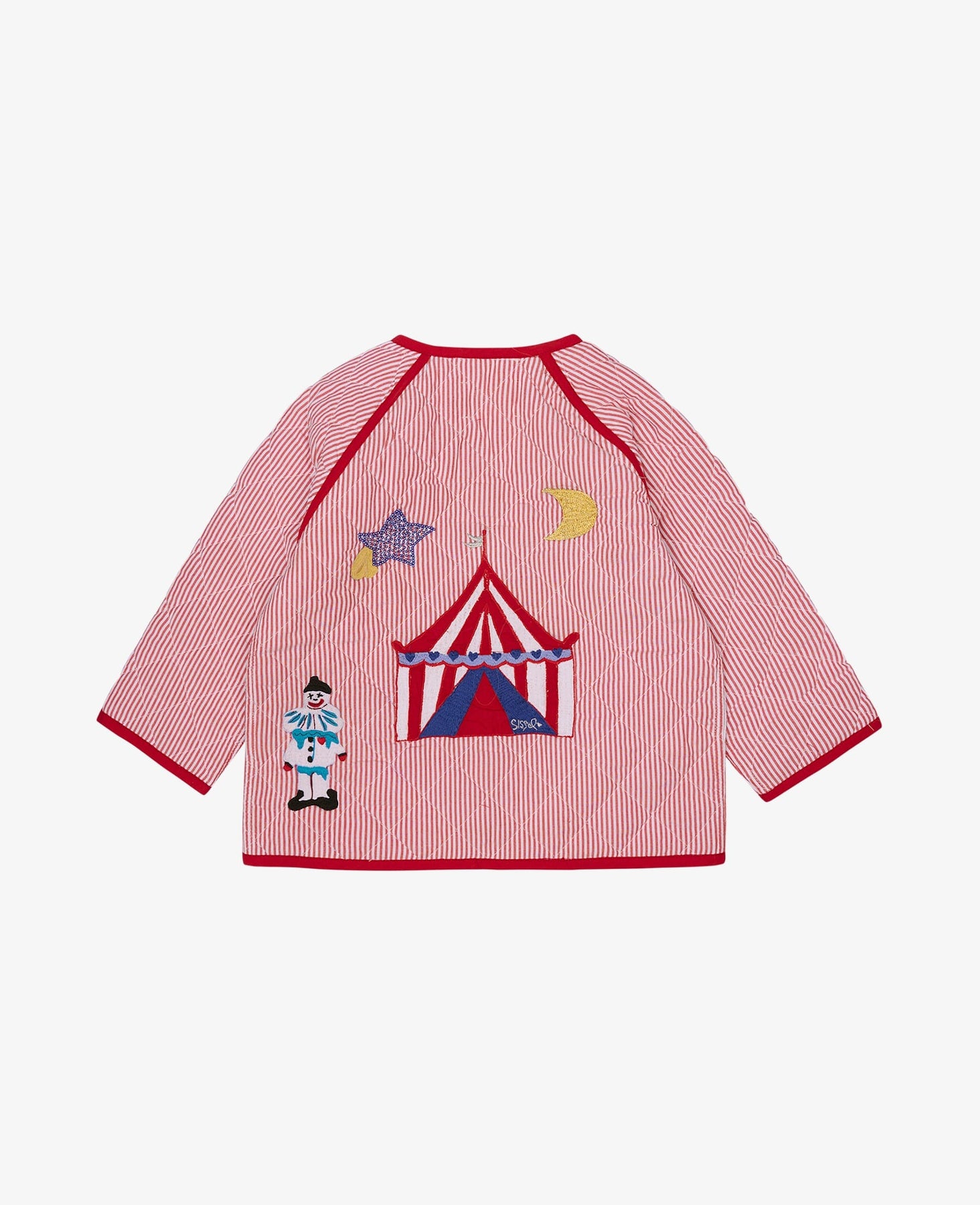 Quiltet jakke i rød-hvitt stripet bomull med sirkusmotiver. Designet har håndlagde detaljer med broderi, perler og paljetter, som gir jakken et kunstnerisk preg.