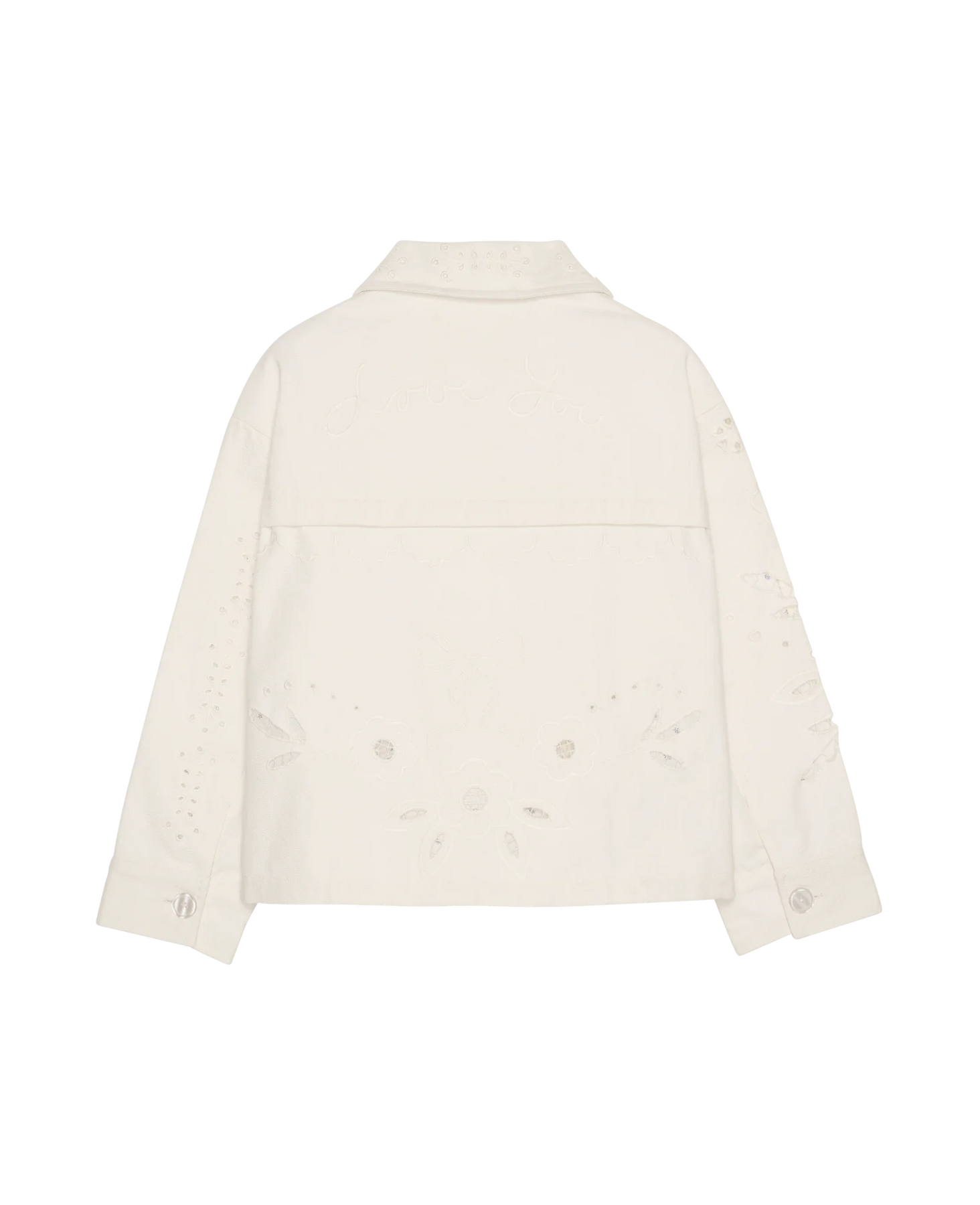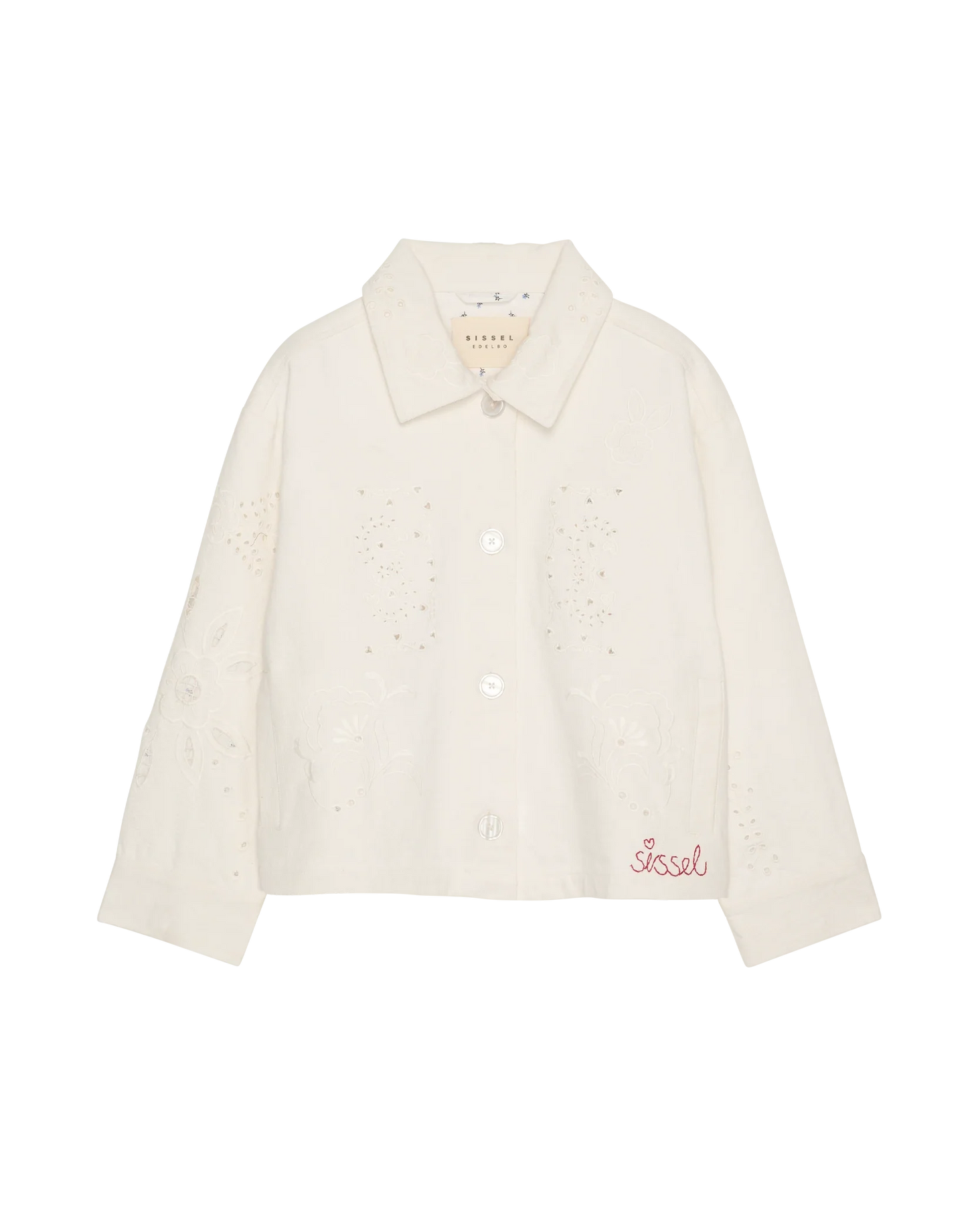 Hvit jakke fra Sissel Edelbo, laget av økologisk bomullstwill. Jakken har broderte blomsterdetaljer på fronten og kragen samt store perlemorsknapper.