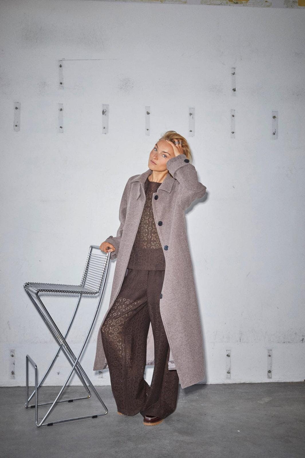 Lang frakk fra Sisters Point i brun melert farge. Frakken er laget av en blanding av polyester, akryl og viskose.