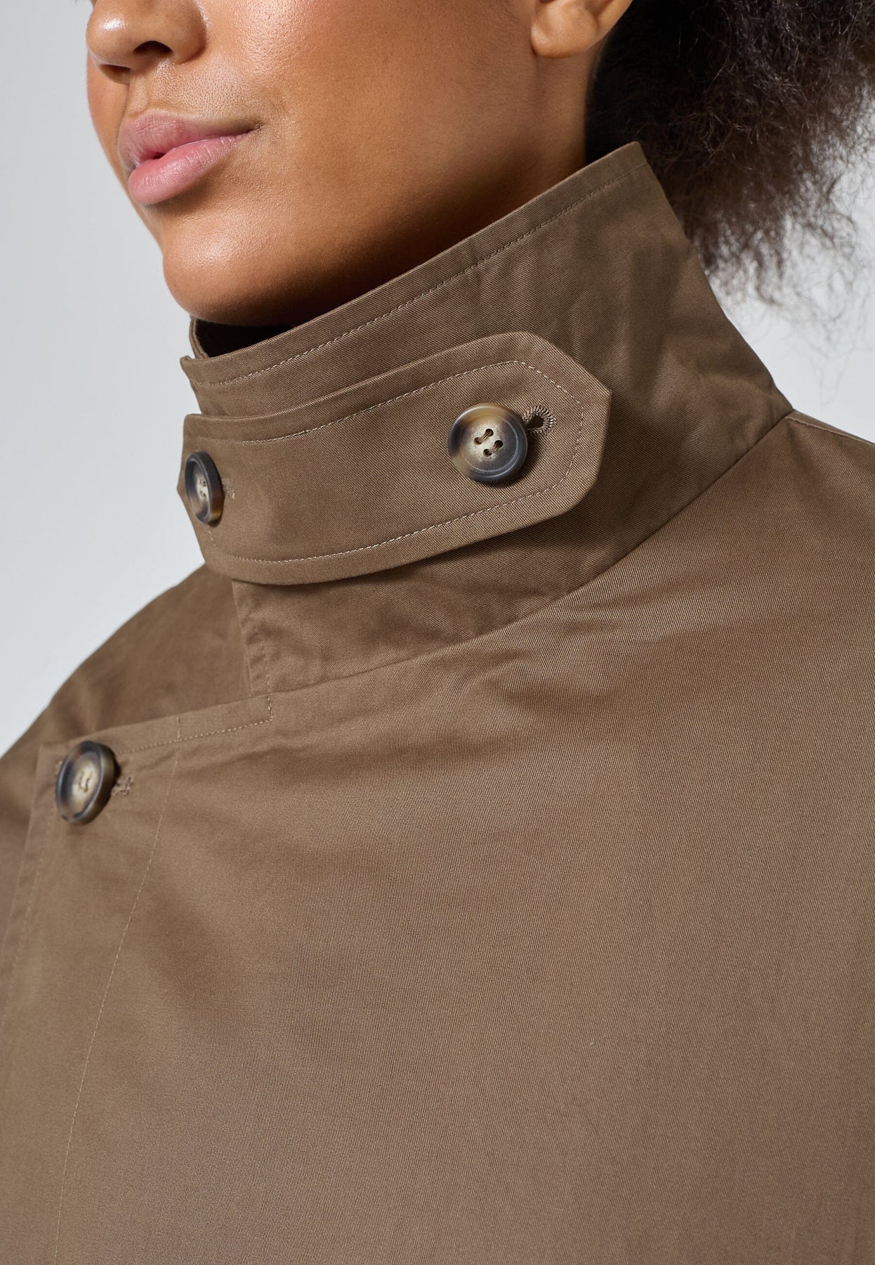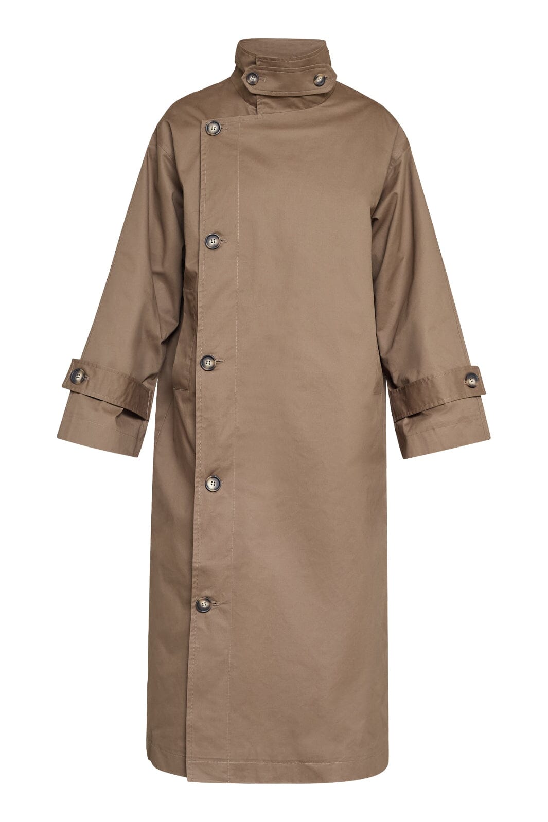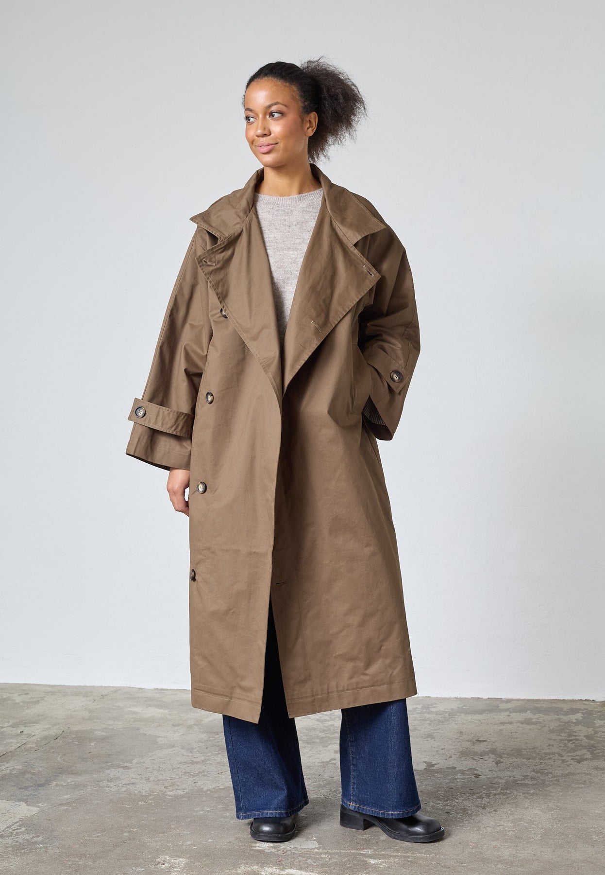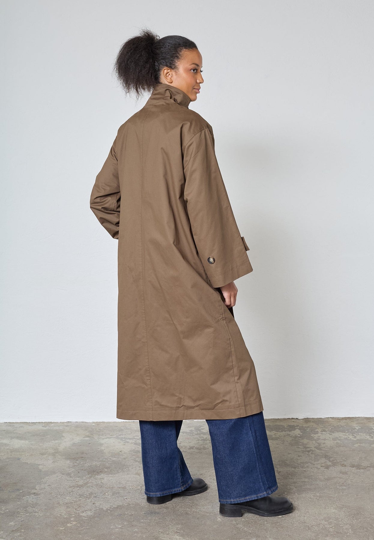 Lang, oversized trenchcoat fra Sisters Point i en brun nyanse. Jakken er laget av 100 % bomull og har knappelukking.