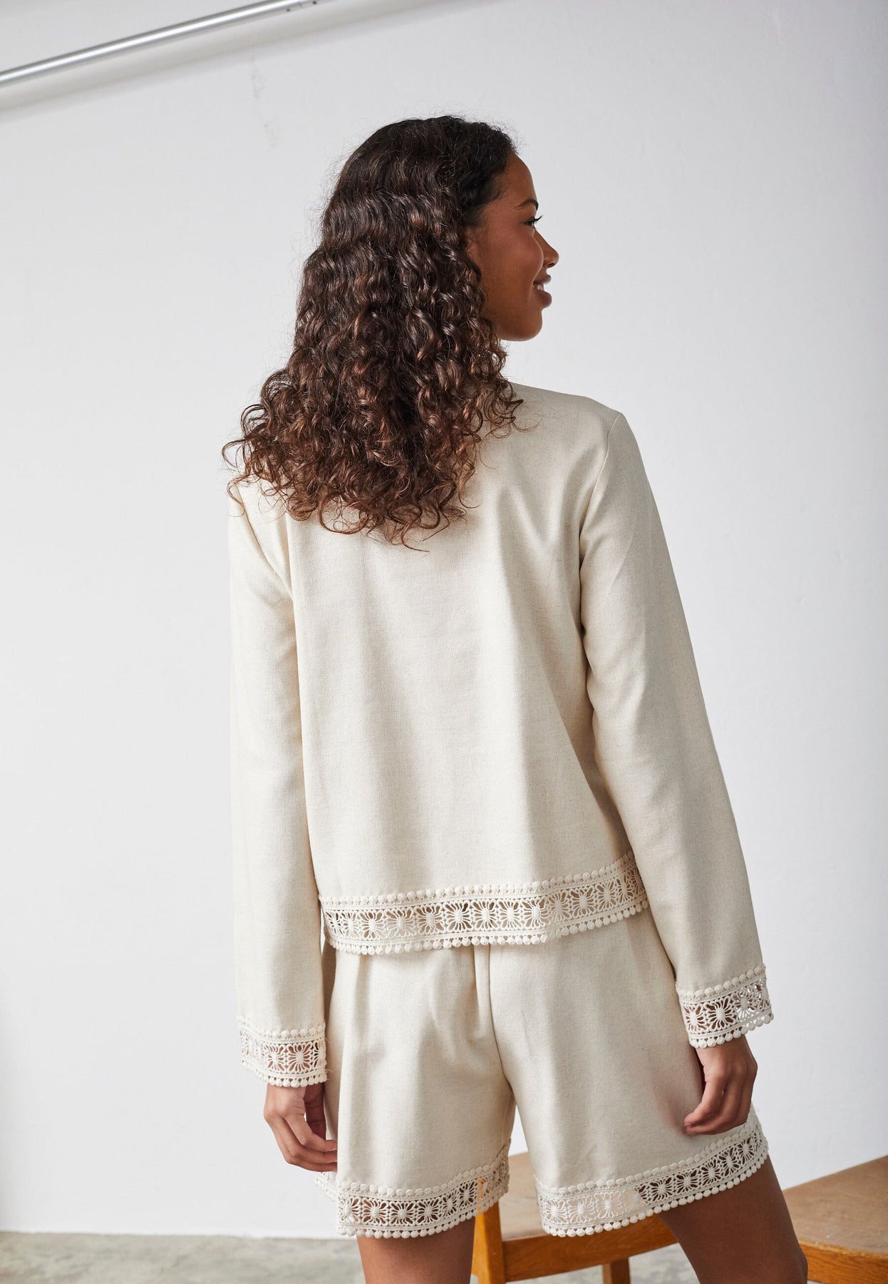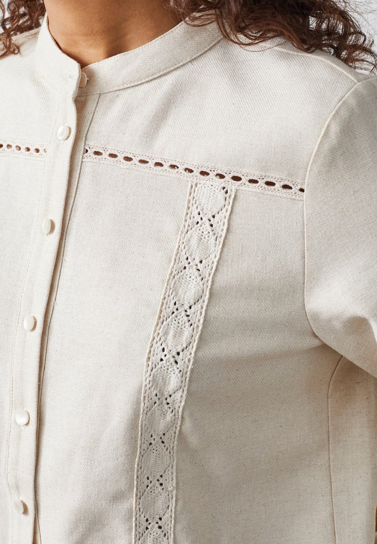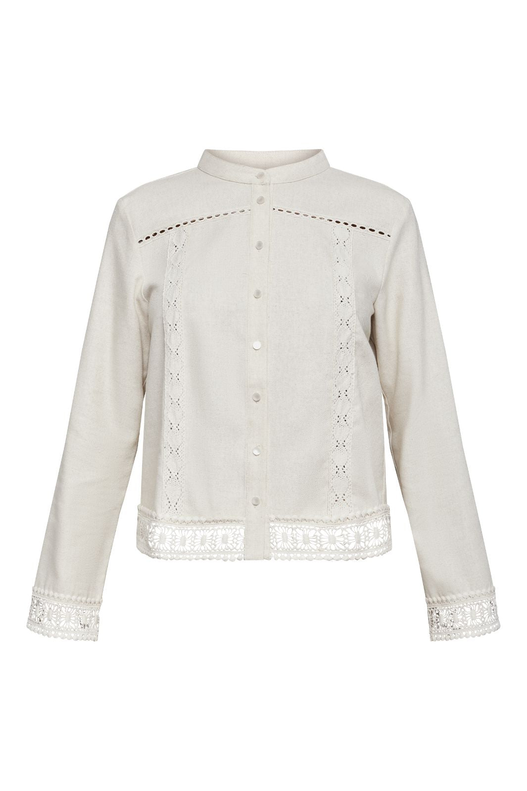 Sandfarget bluse fra Sisters Point med høy hals og knapper foran. Blusen har lange ermer og et gjennomvevd blondemønster som går igjen både i fronten og på ermene.
