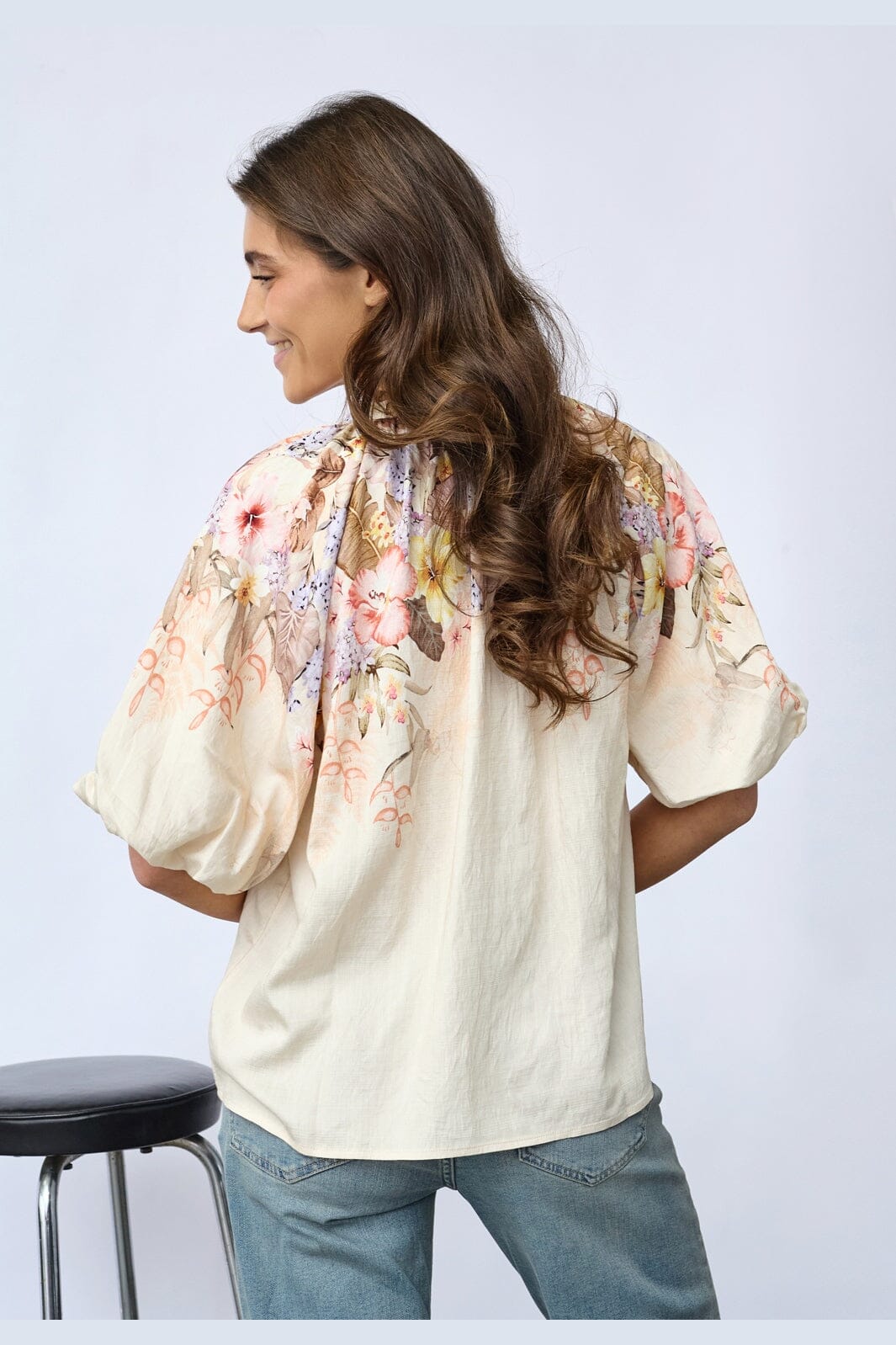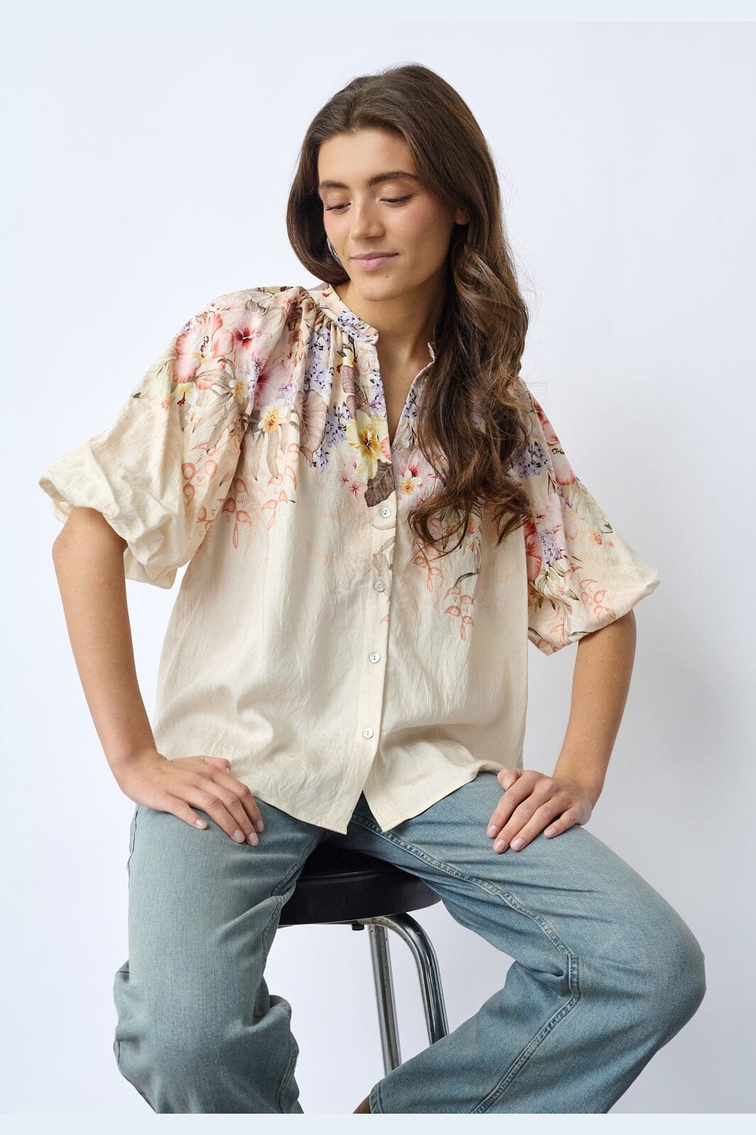 Skjorte fra Sisters Point med et blomstertrykk i krem- og hvite nyanser. Skjorten er laget av 89 % viskose og 11 % polyamid.