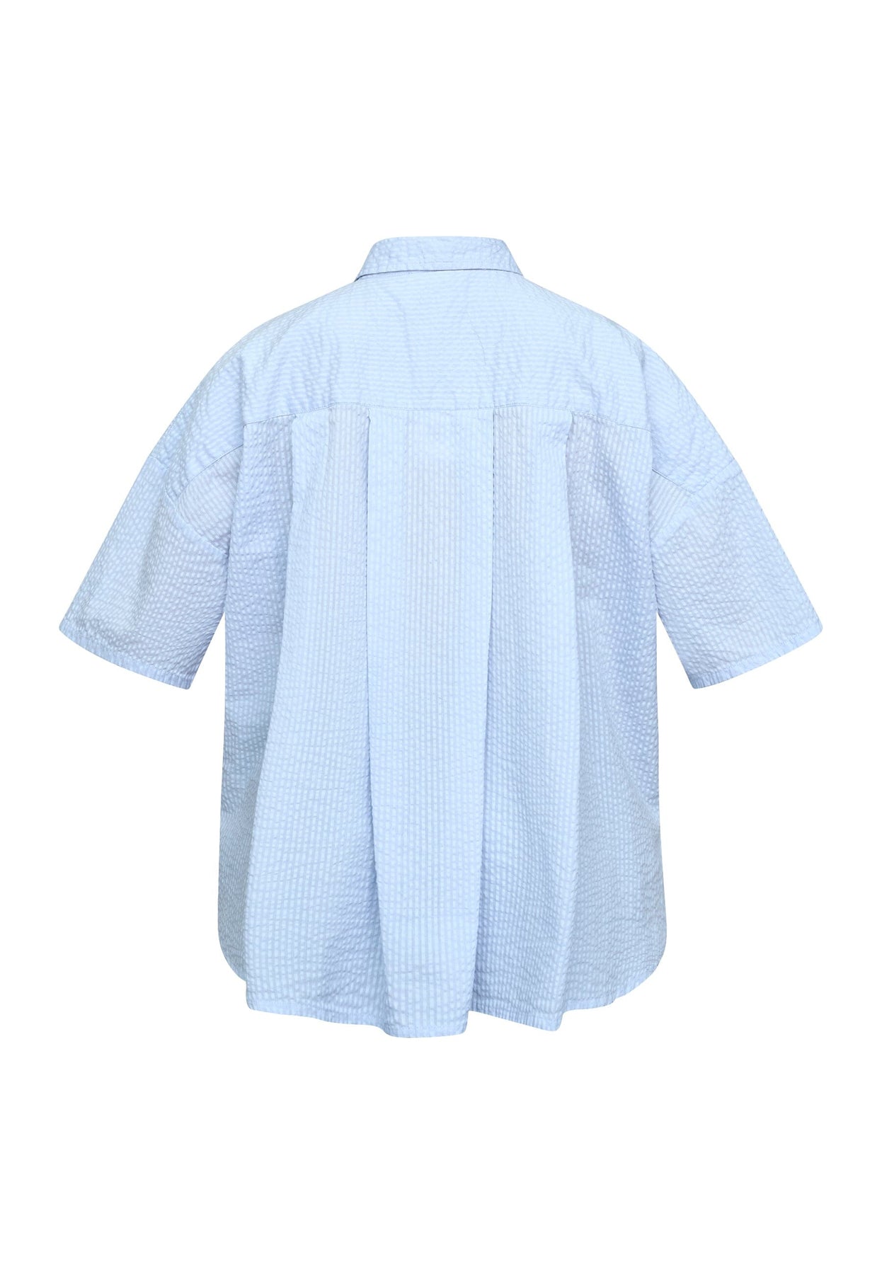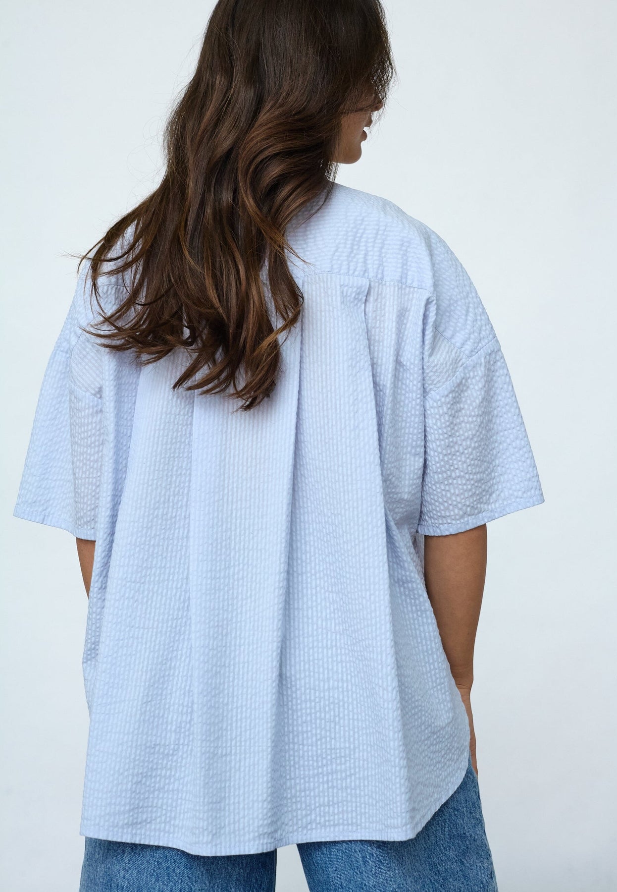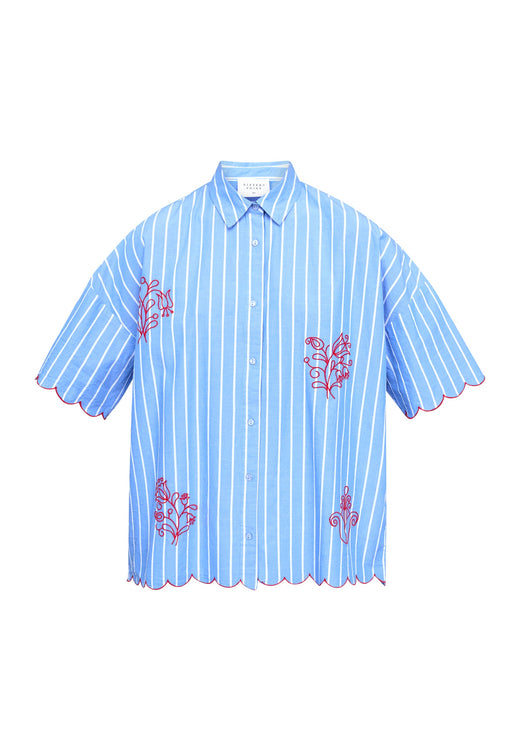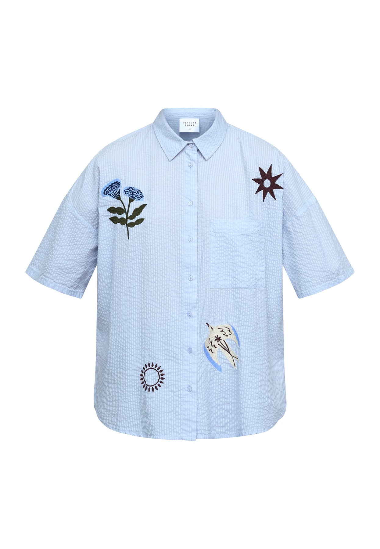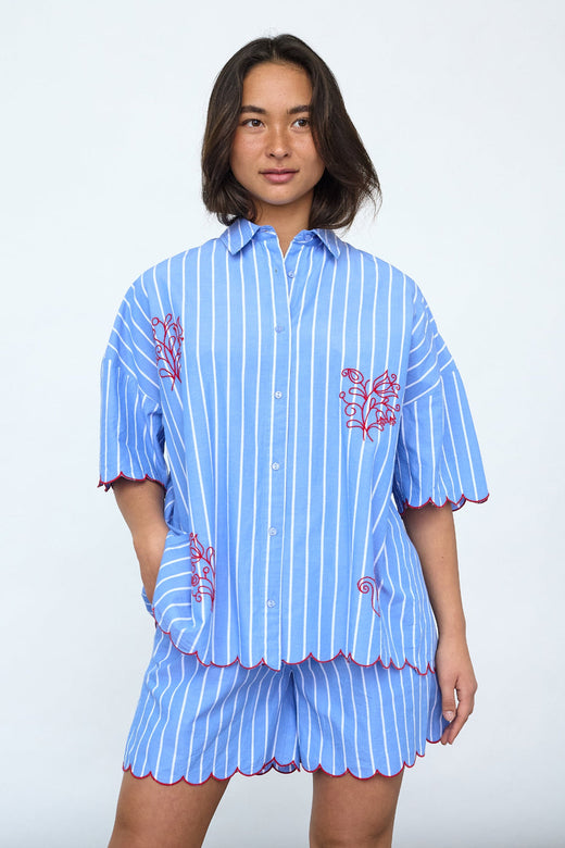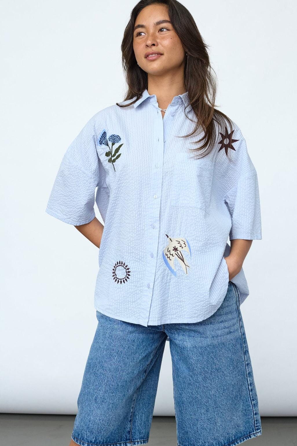 Oversized skjorte fra Sisters Point i lyseblå med stripemønster. Skjorten har broderte motiver av blomster og fugler.