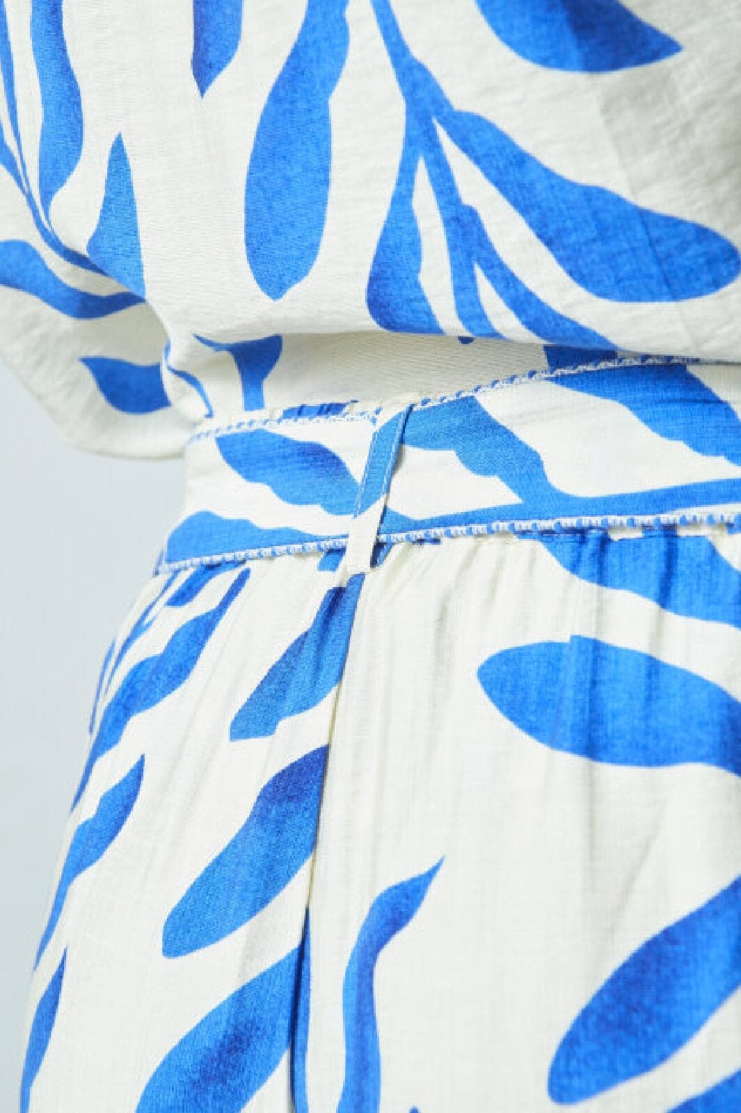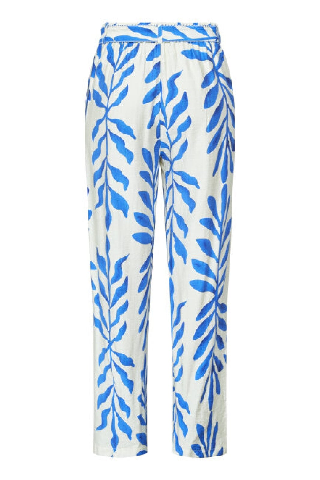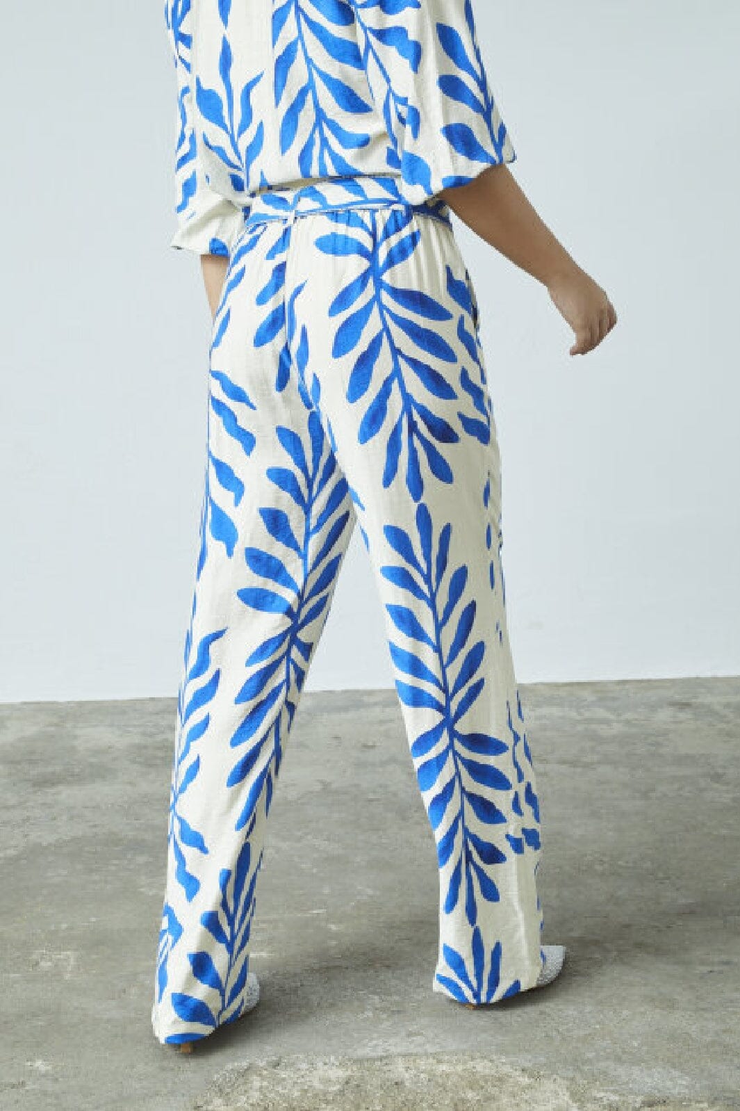 Loose bukser med blått bladmønster på kremfarget bakgrunn. Buksene har høy midje med snøring og rette ben, noe som gir god bevegelsesfrihet.