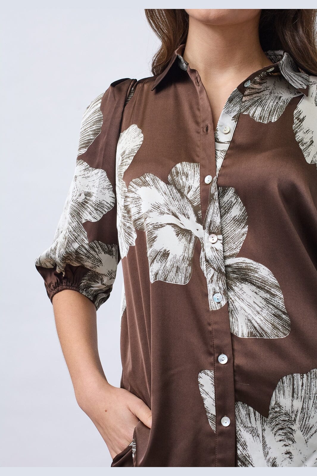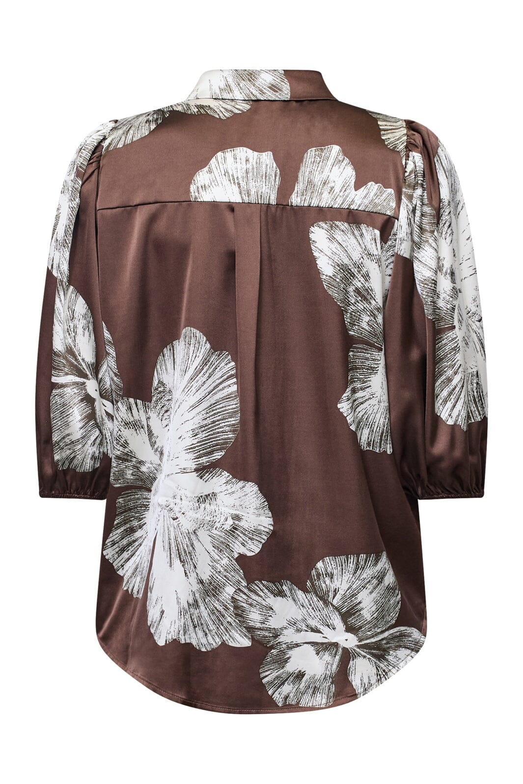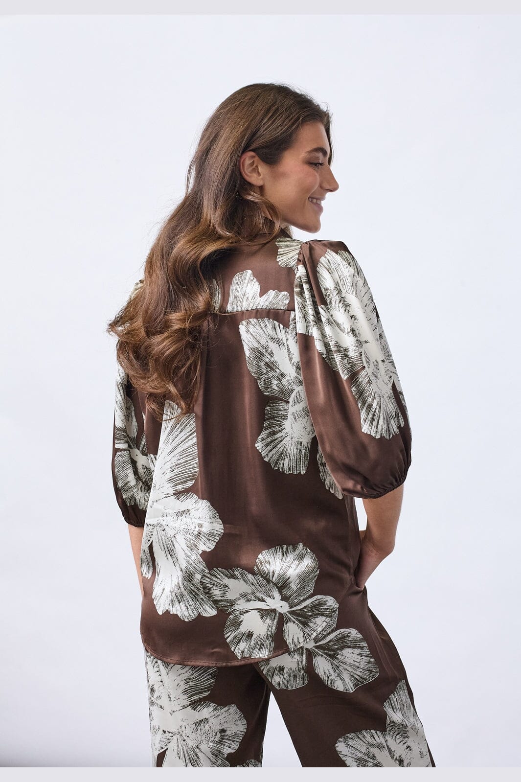 Skjorte fra Sisters Point i brun sateng med grafisk blomsterprint i hvite nyanser. Skjorten har klassisk krage og knappelukking.
