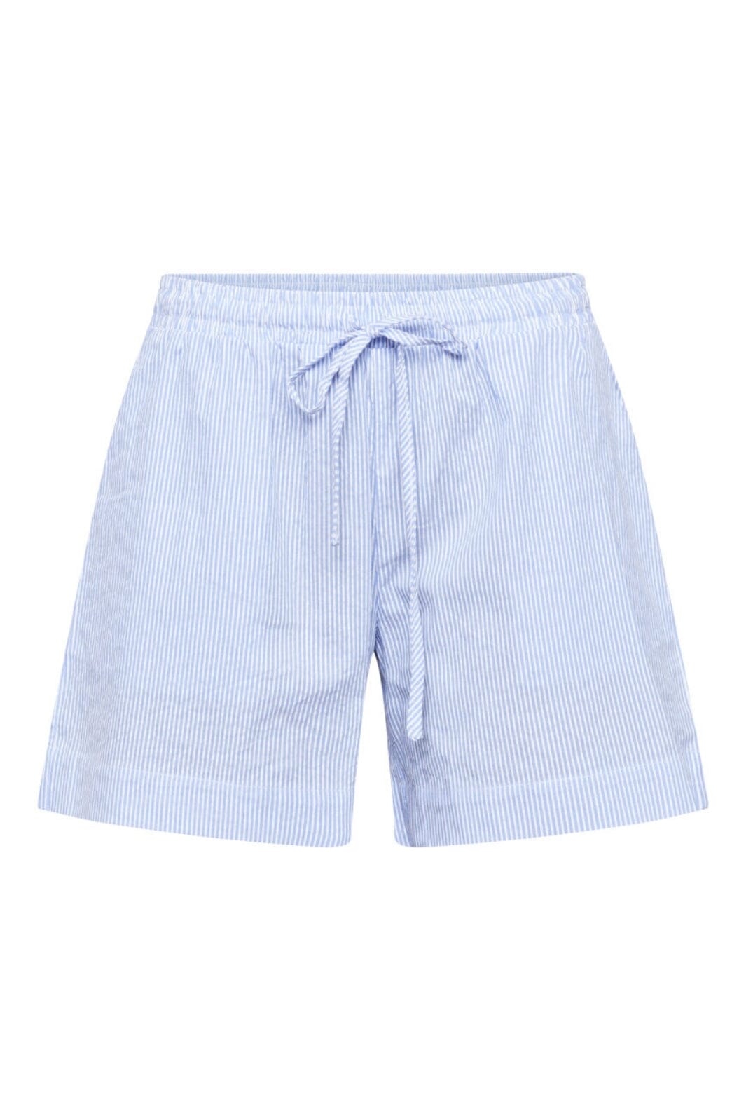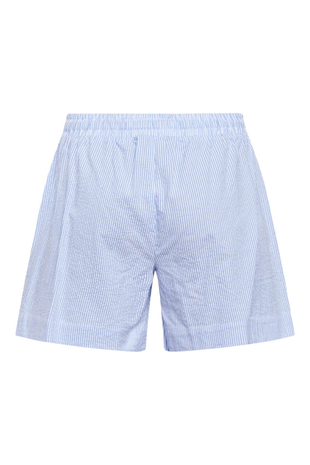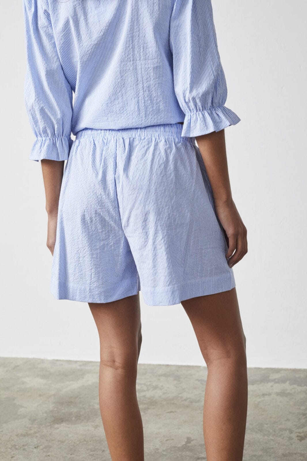 Stripete shorts fra Sisters Point i blått og hvitt. De løstsittende shortsen har høy midje med elastikk og snøring som gir mulighet for individuell tilpasning.