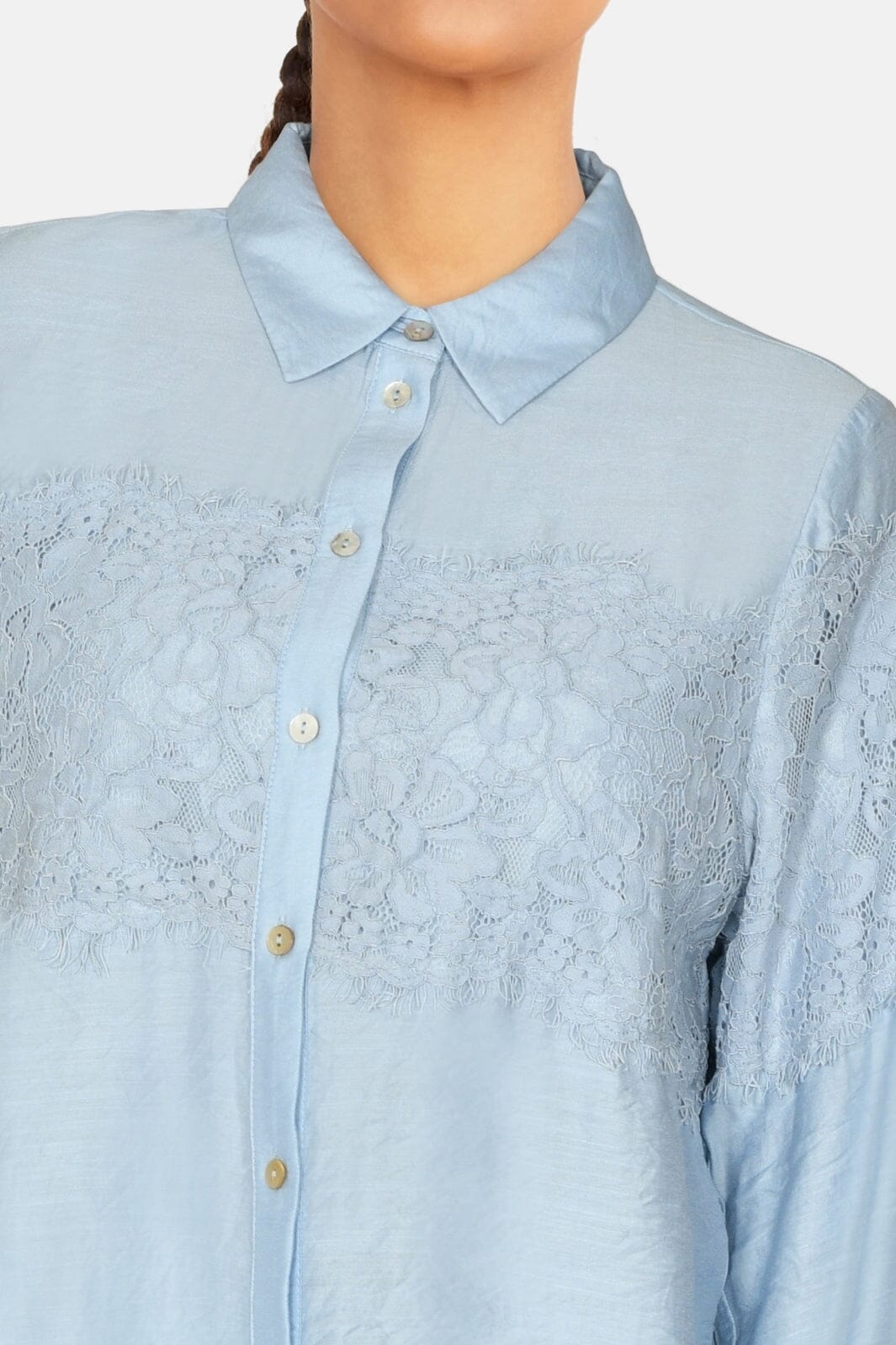En løstsiddende ensfarvet skjorte med et blondestykke henover brystet, ryggen og ærmerne. Modellen er 172 cm og har en størrelse S på.