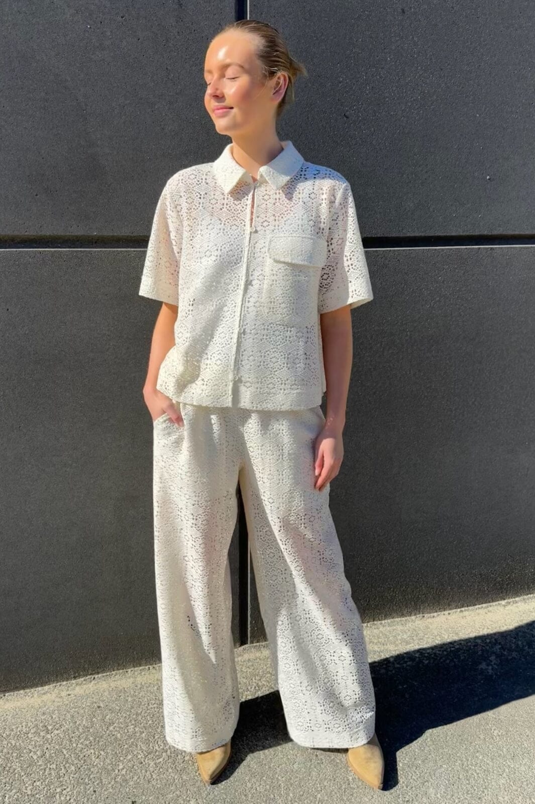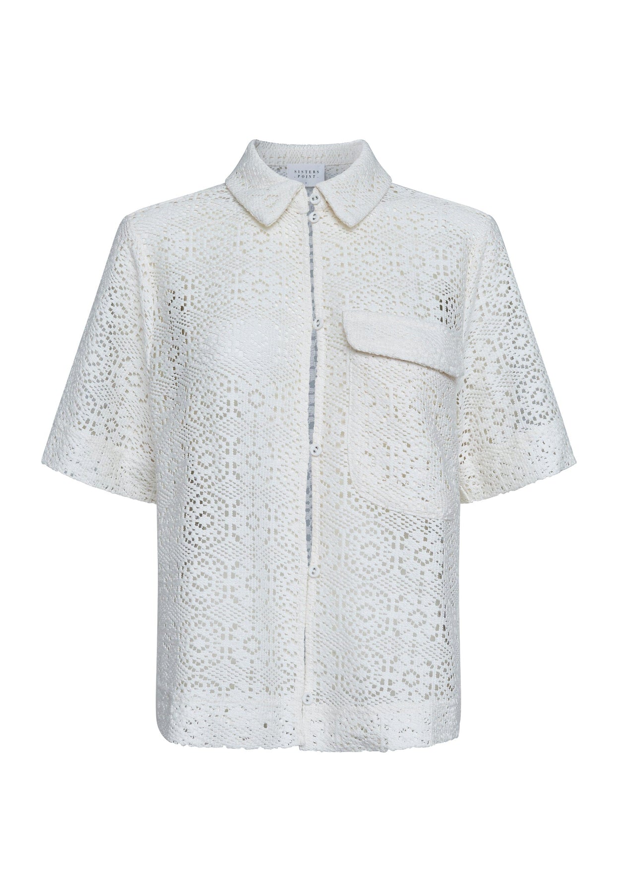 Cremefarget skjorte fra Sisters Point med blondermønster i burnout-stil. Skjorten har klassisk krage, korte ermer og knapper hele veien ned.