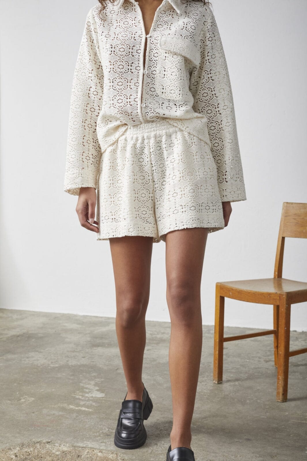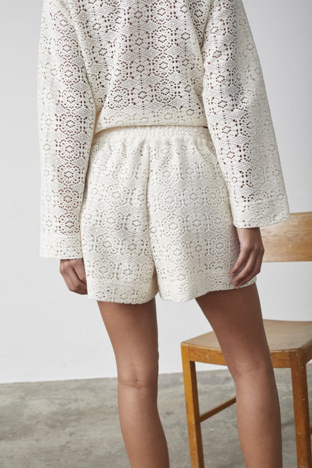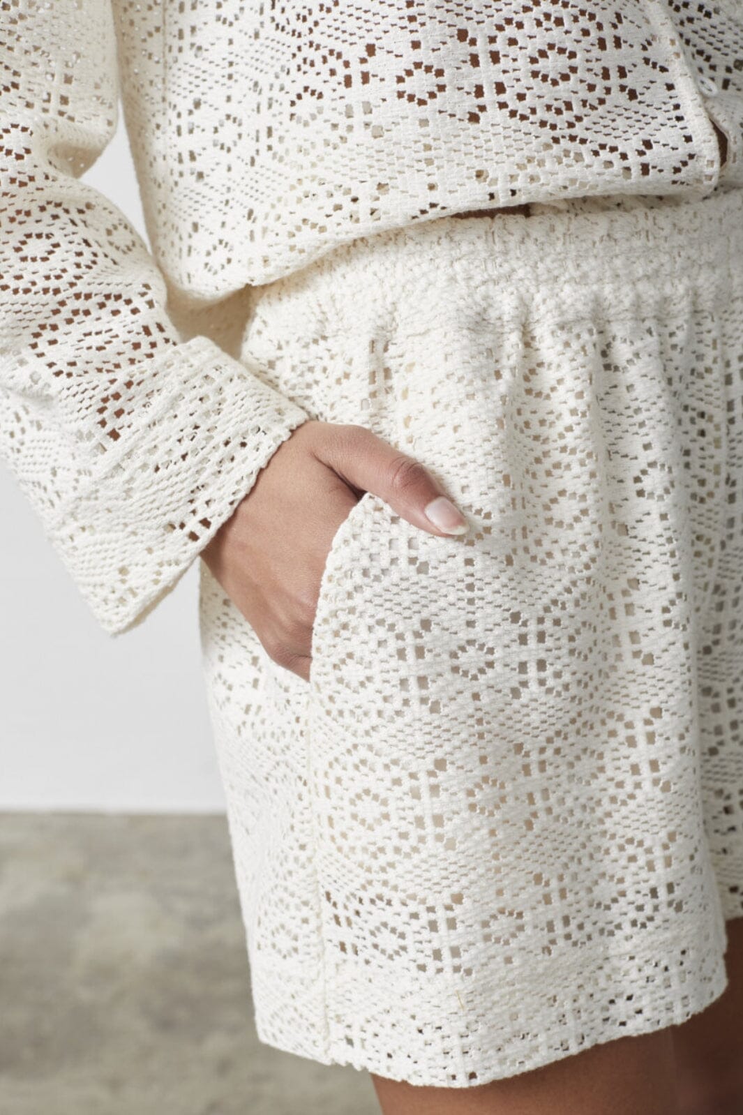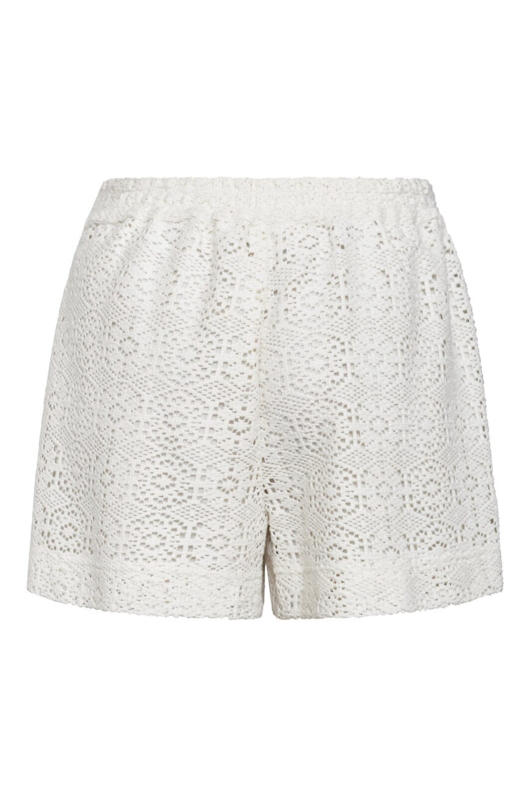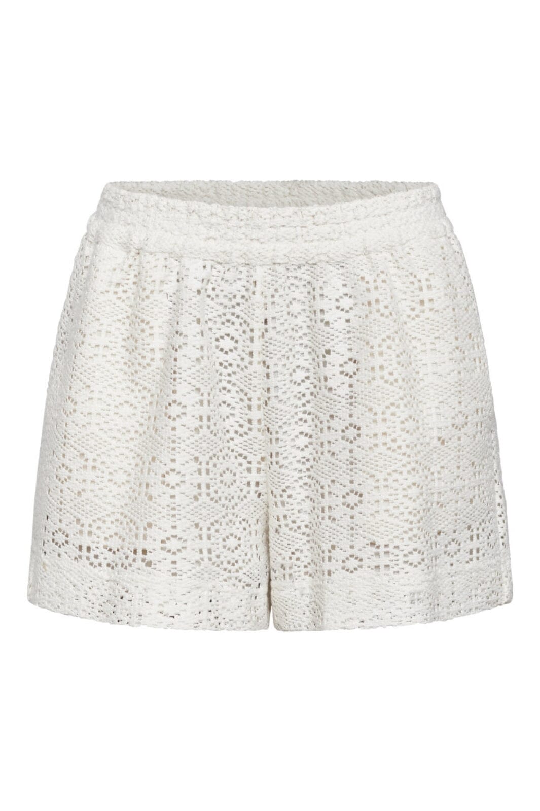 Kremfargede shorts fra Sisters Point med blondermønster. Shortsene har en løs passform og er laget i et vevd stoff med fine detaljer.