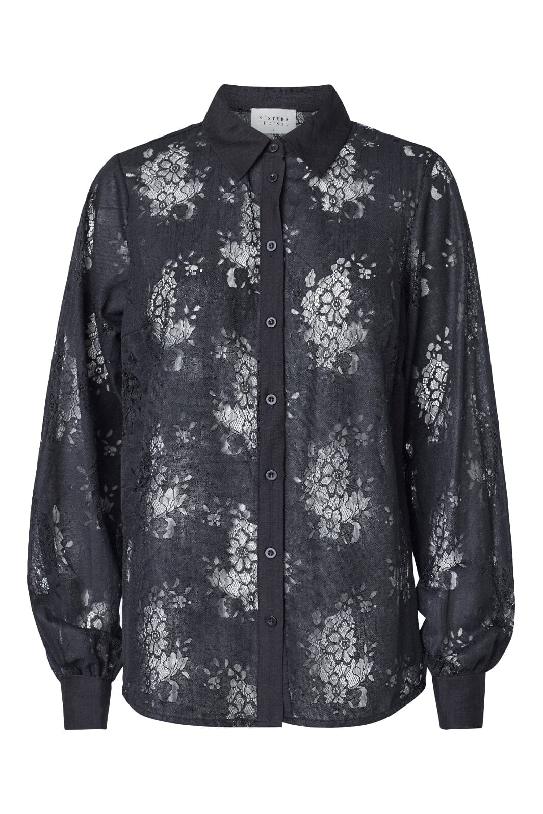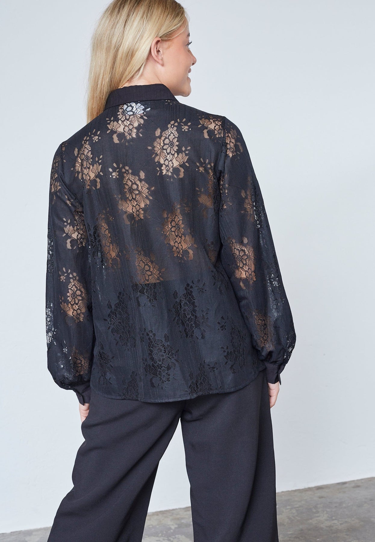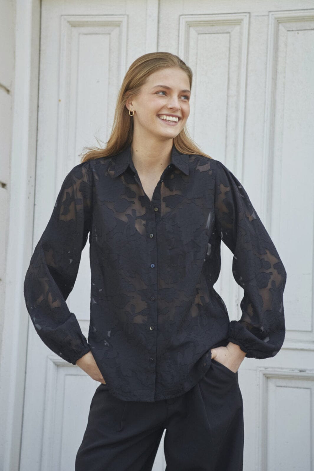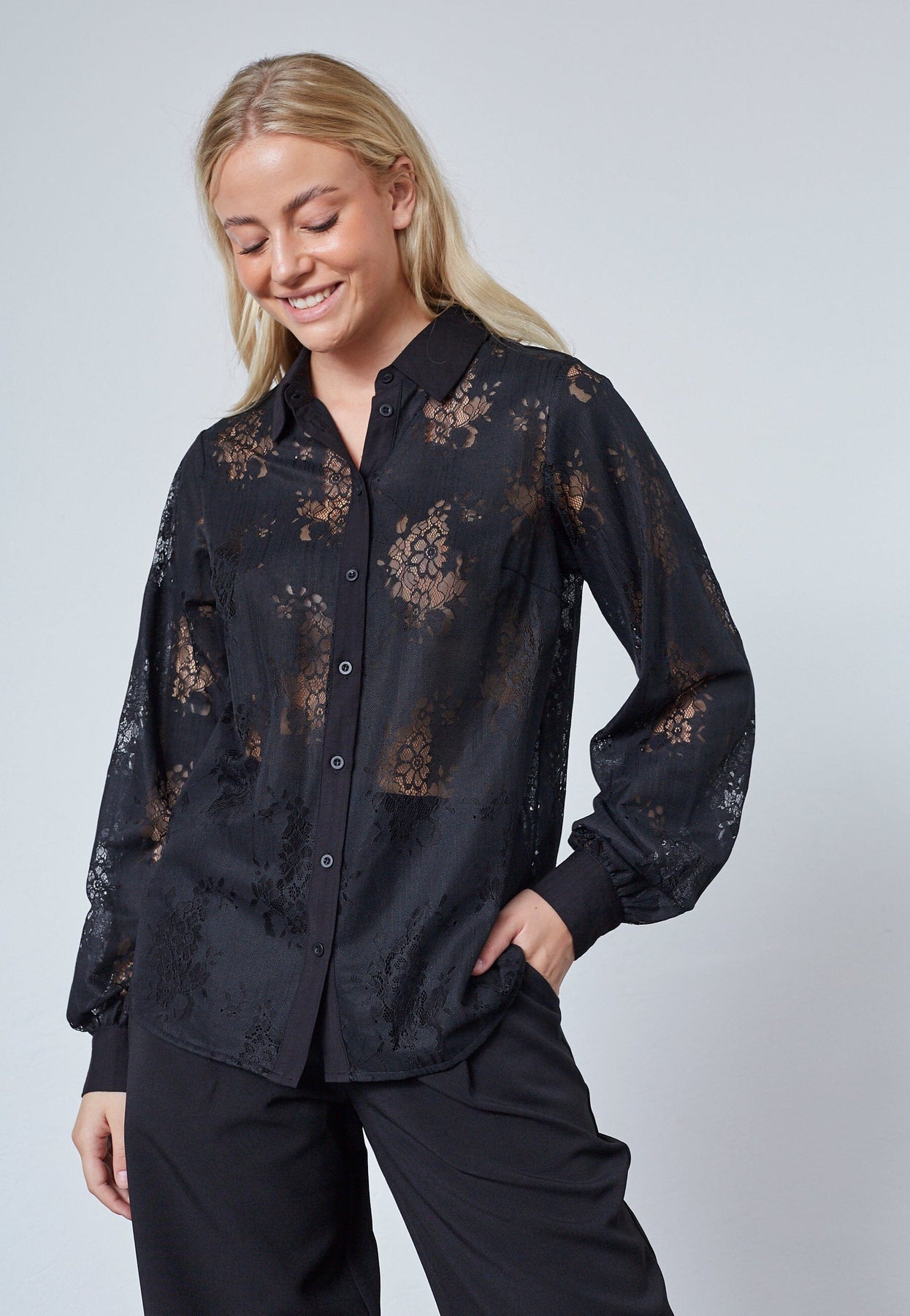Svart skjorte fra Sisters Point med gjennomsiktig blomstermønster i blonde. Skjorten har en løs passform med klassisk krage og knappelukking foran. De lange ermene avsluttes med mansjetter.