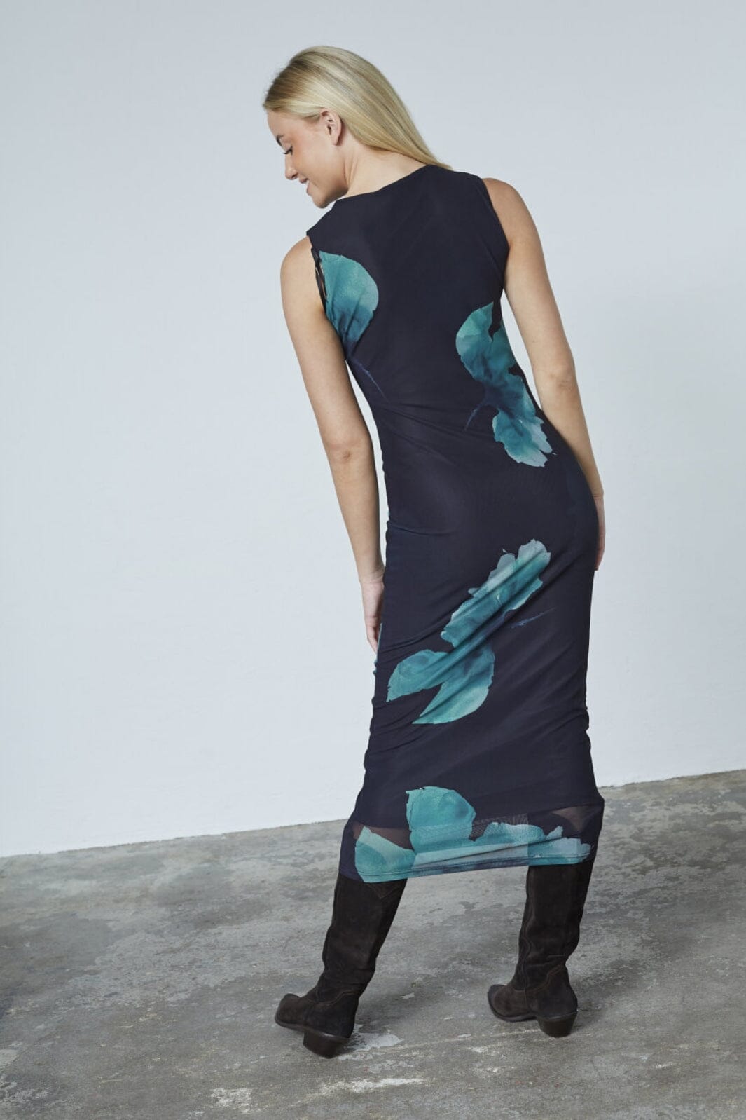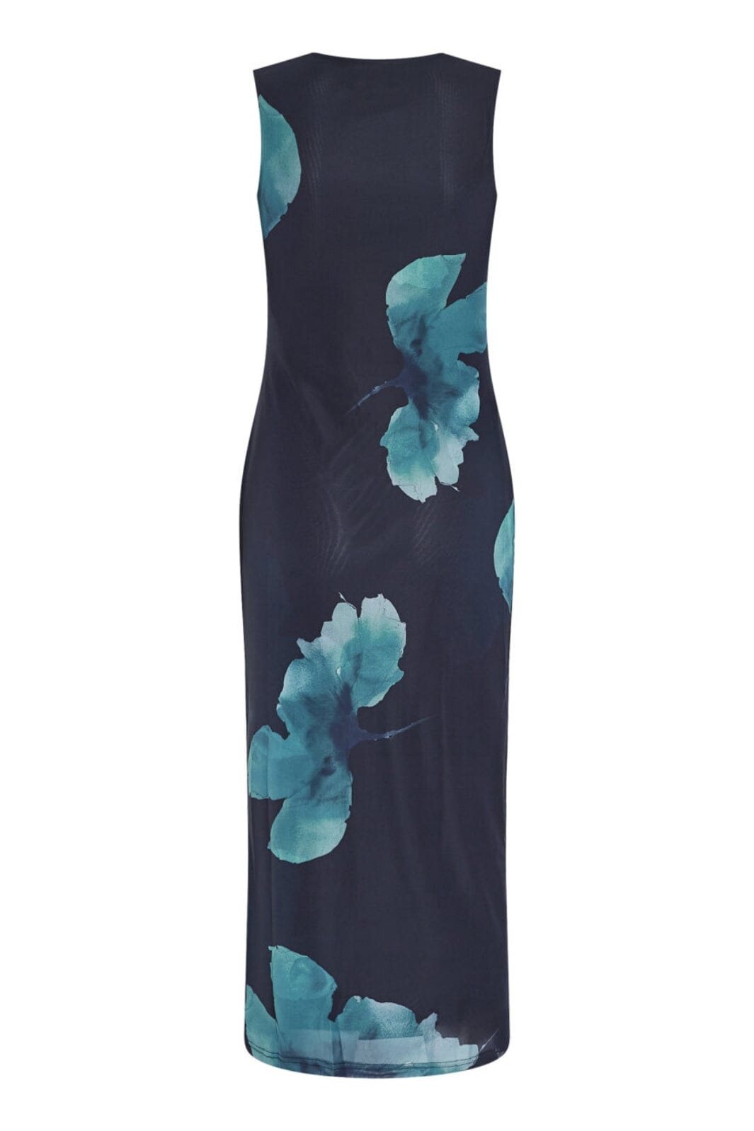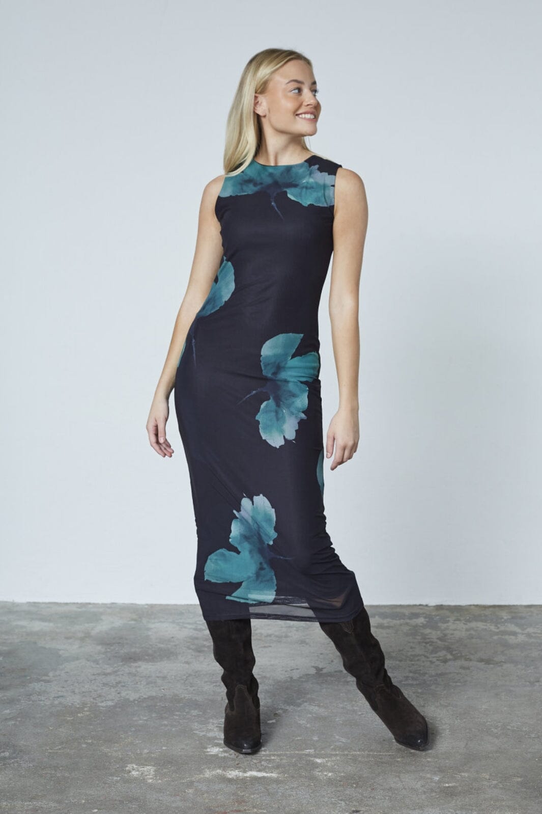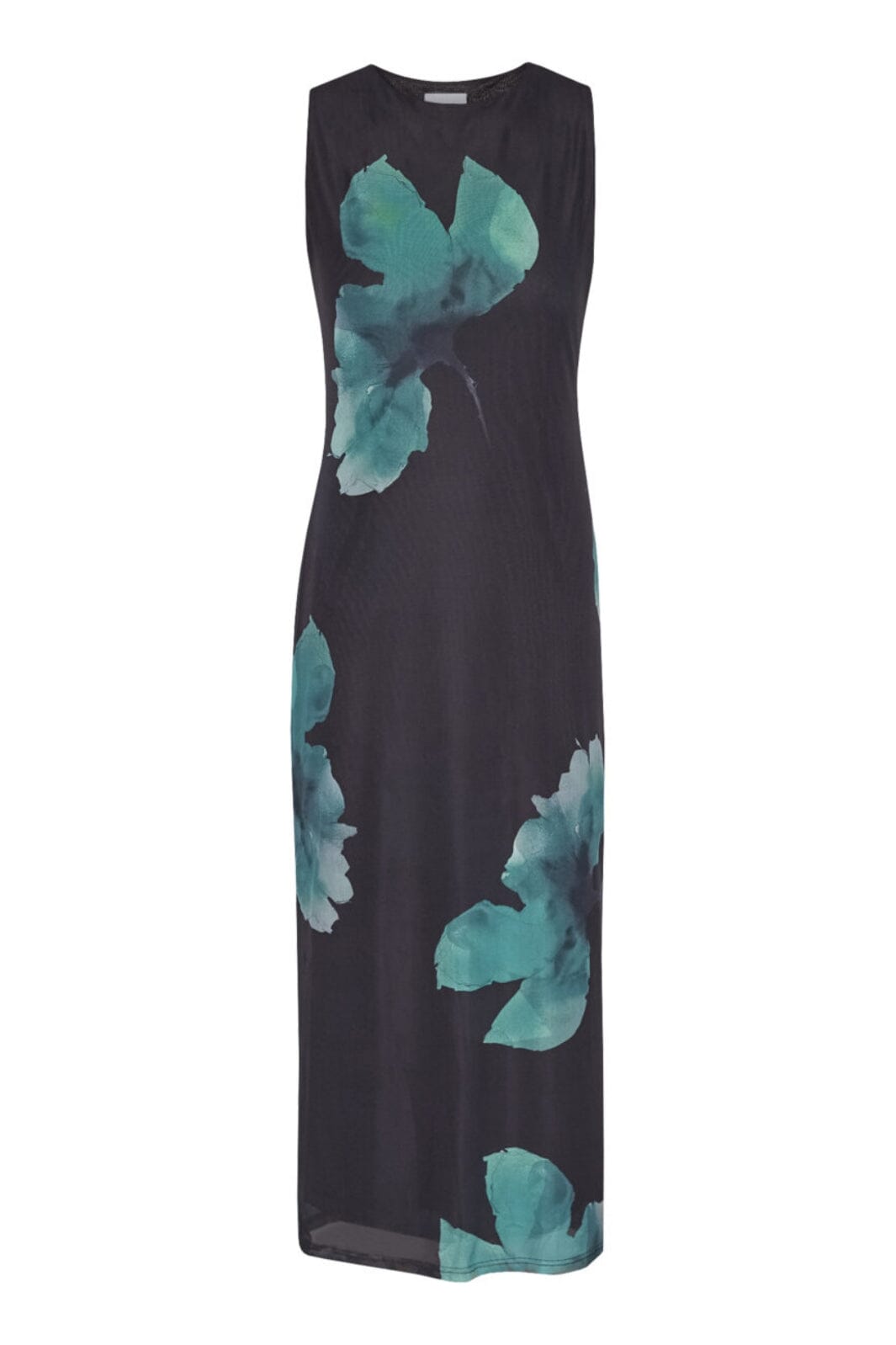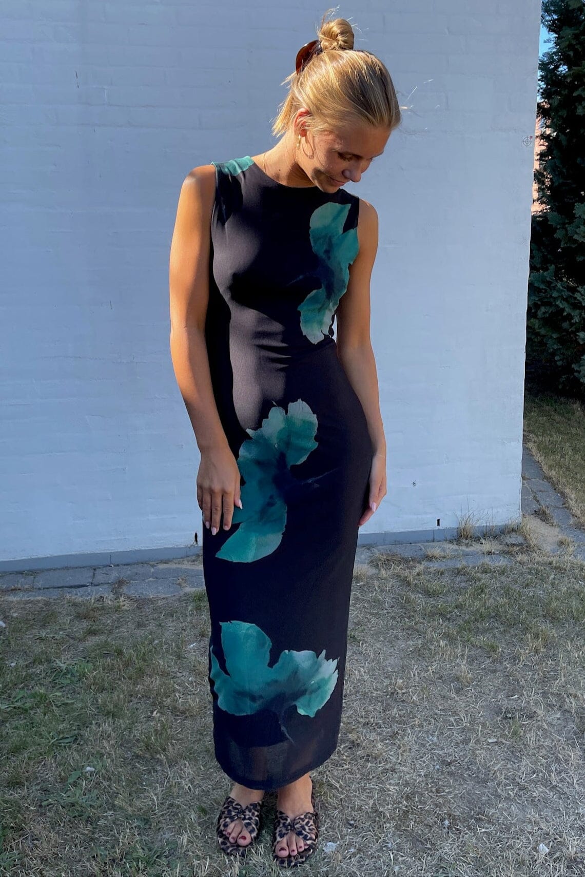 er en ermeløs lang kjole. Kjolen har et stort, blomstrete print og en klassisk, rund halsutskjæring. Den er i en lett og transparent kvalitet. Modellen har en str. S på.