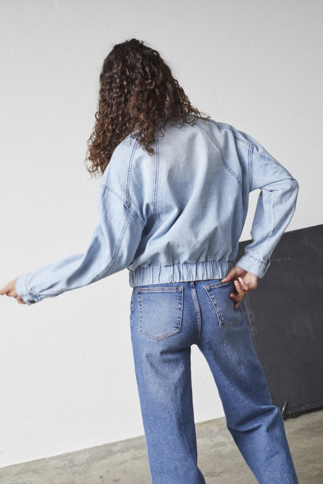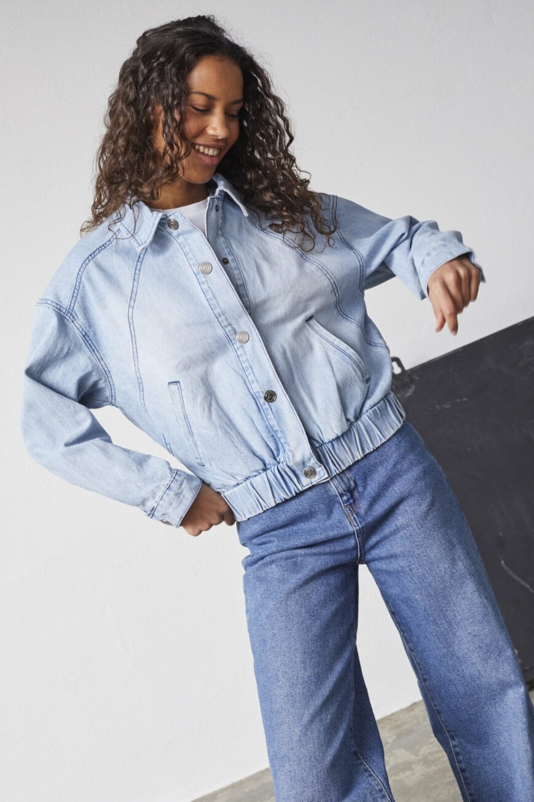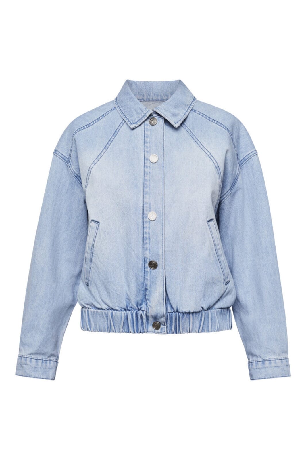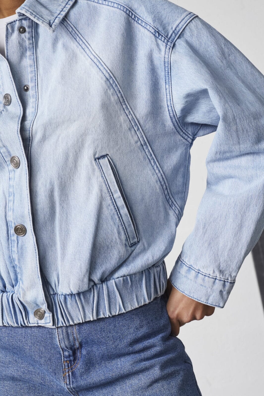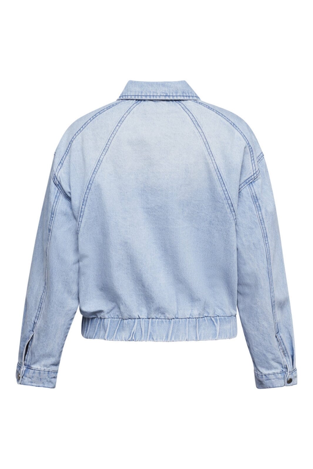 Lys blå denimjakke fra Sisters Point med skjortekrage og knapplukking. Jakken har en løs passform med elastisk midje og lange ermer med mansjetter.