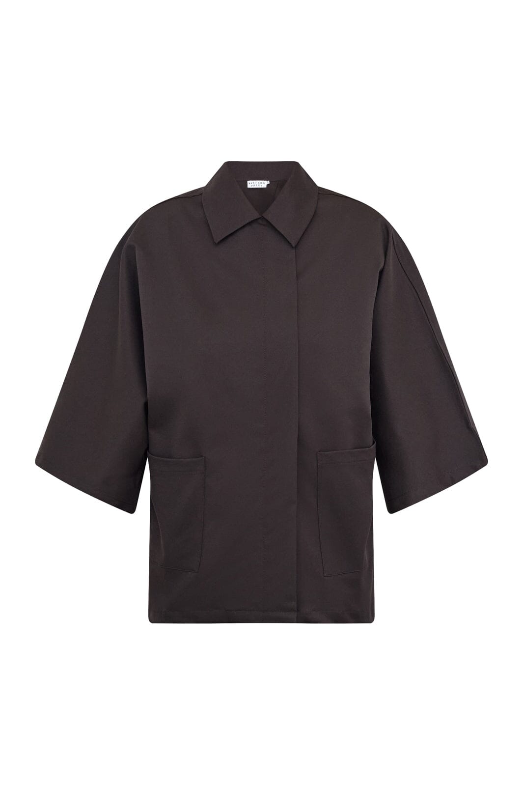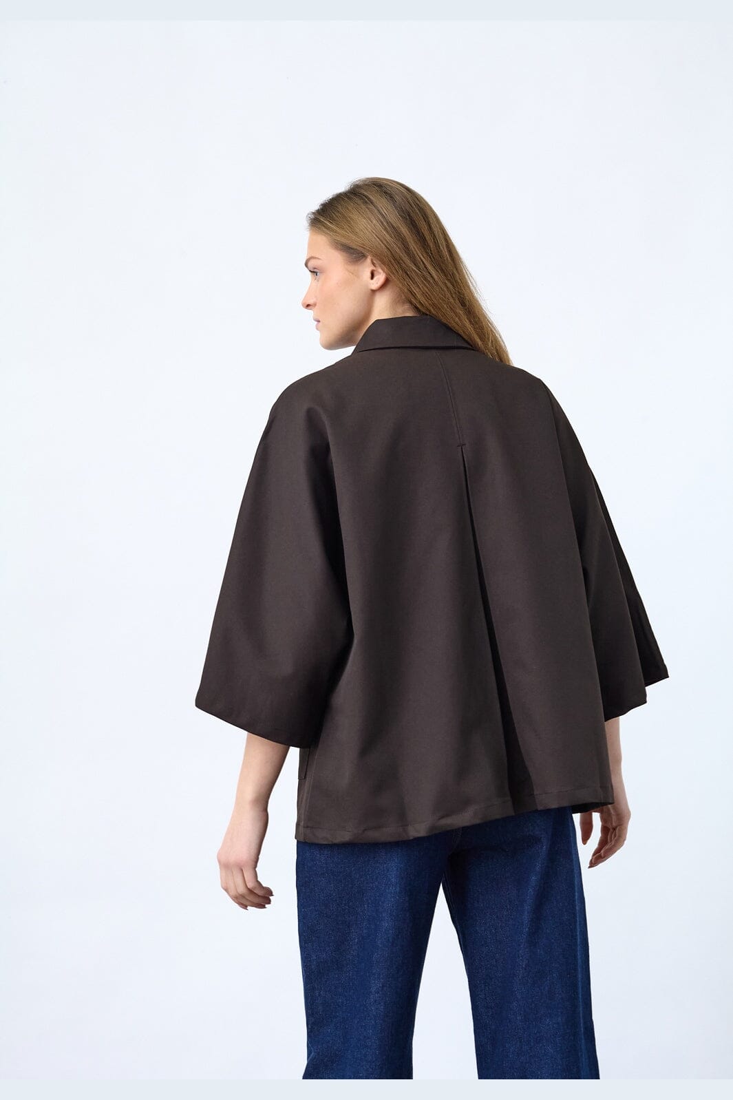 En ensfarget jakke fra Sisters Point i mørk sjokoladebrun. Jakken har en oversized passform og 3/4-ermer med vide snitt.