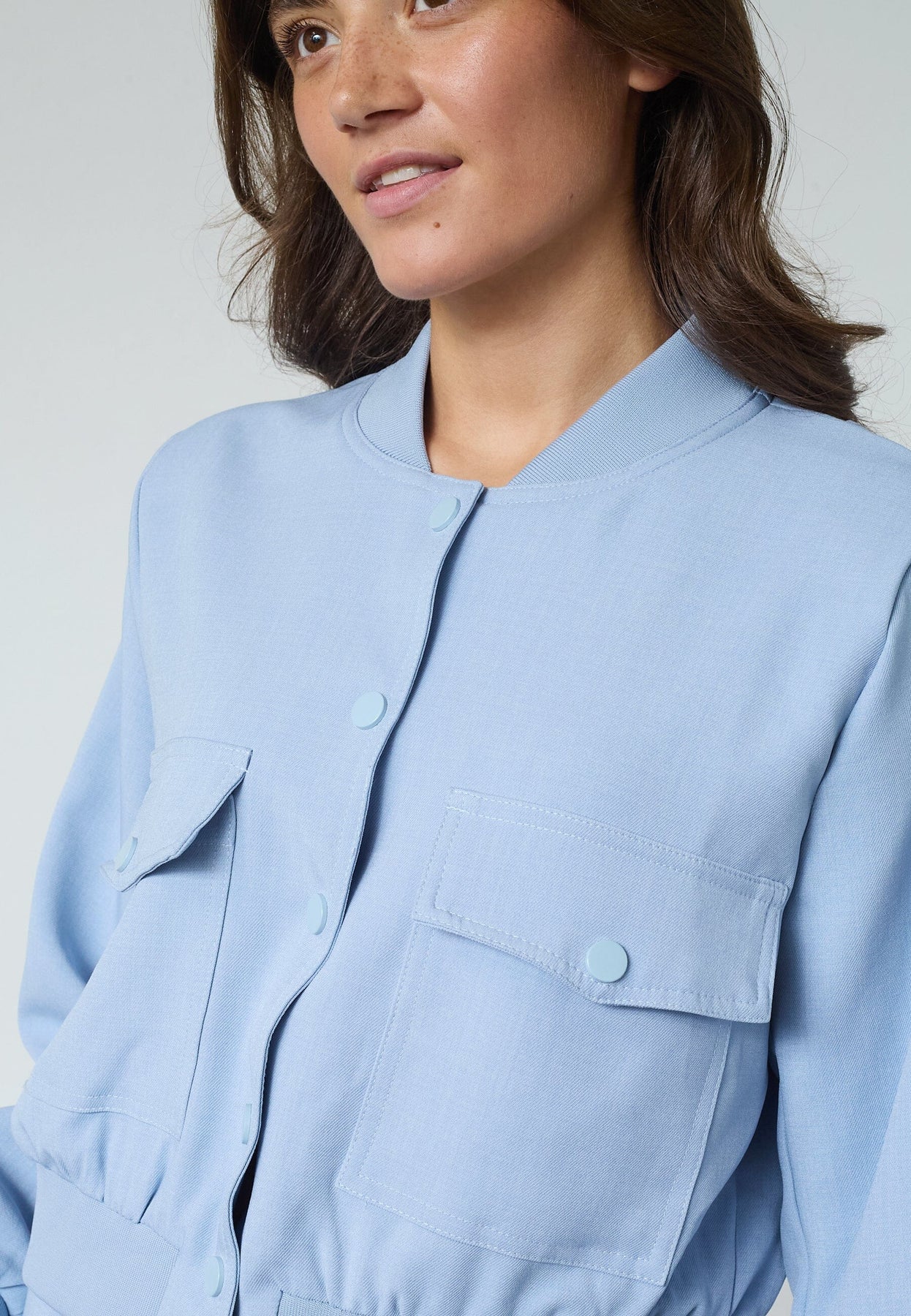 Lyseblå jakke fra Sisters Point, laget av polyester med elastan. Jakken har en kort passform og passer til avslappede anledninger.