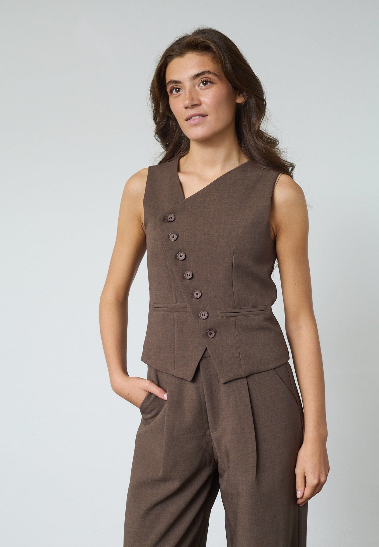 Brun vest fra Sisters Point, laget av polyester med elastan. Vesten har V-hals og en slim fit-passform med asymmetrisk knappelukking.