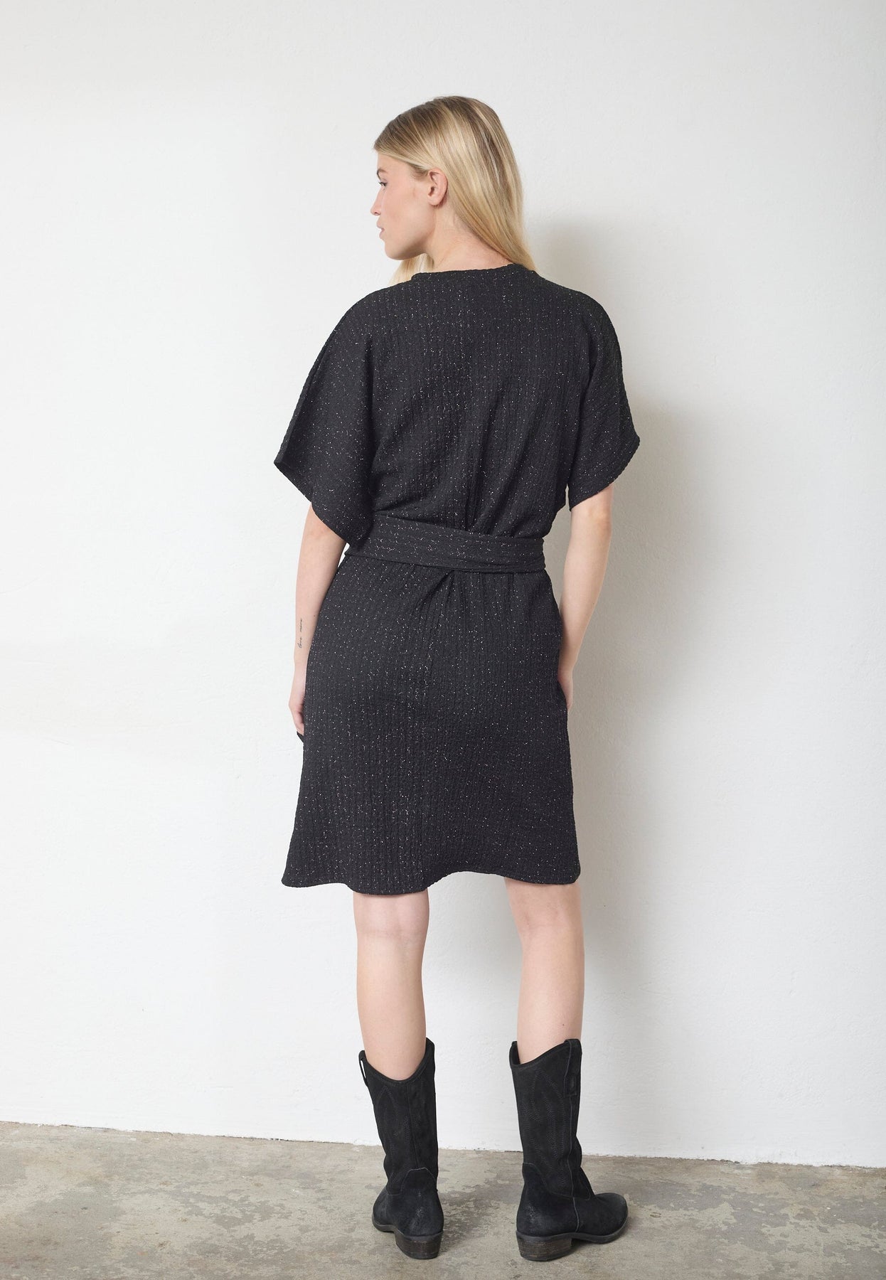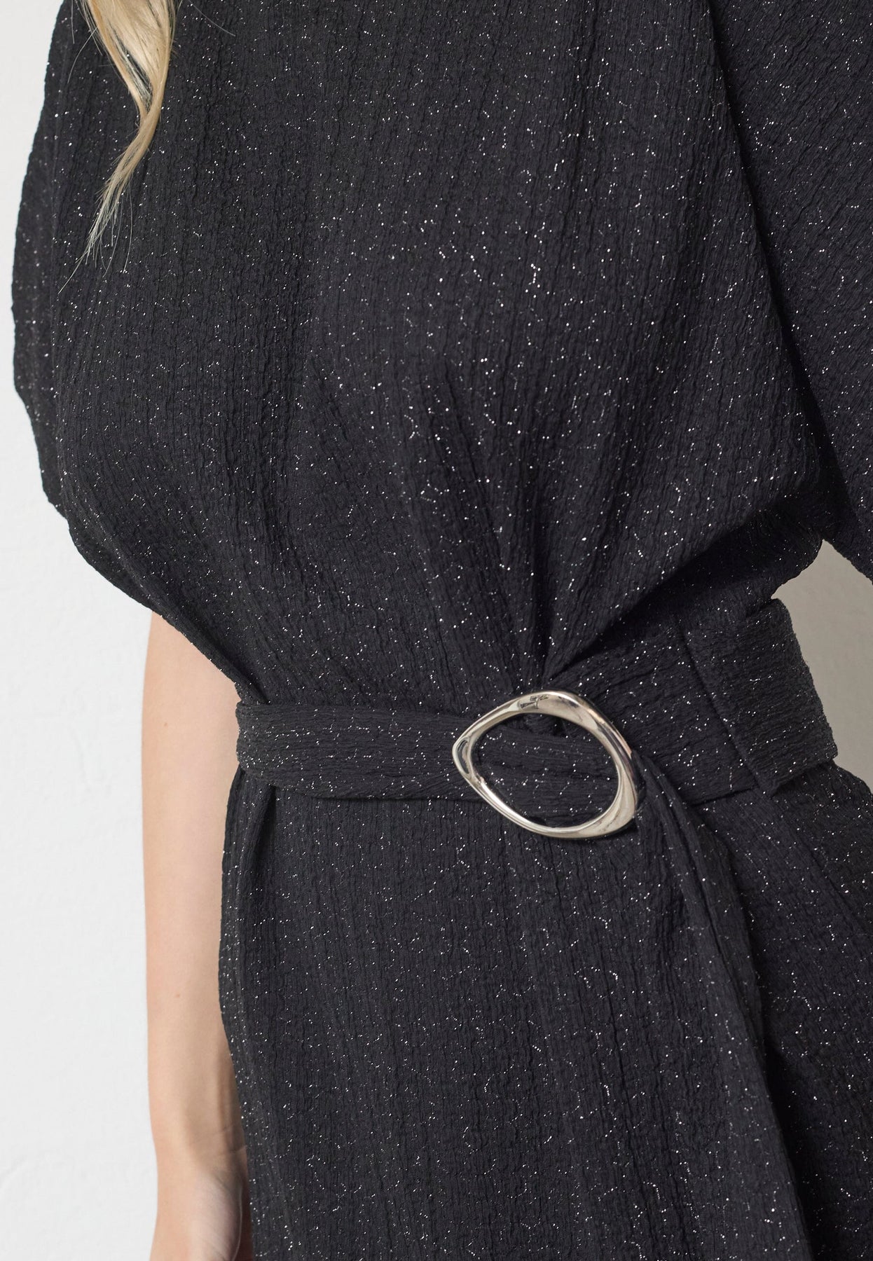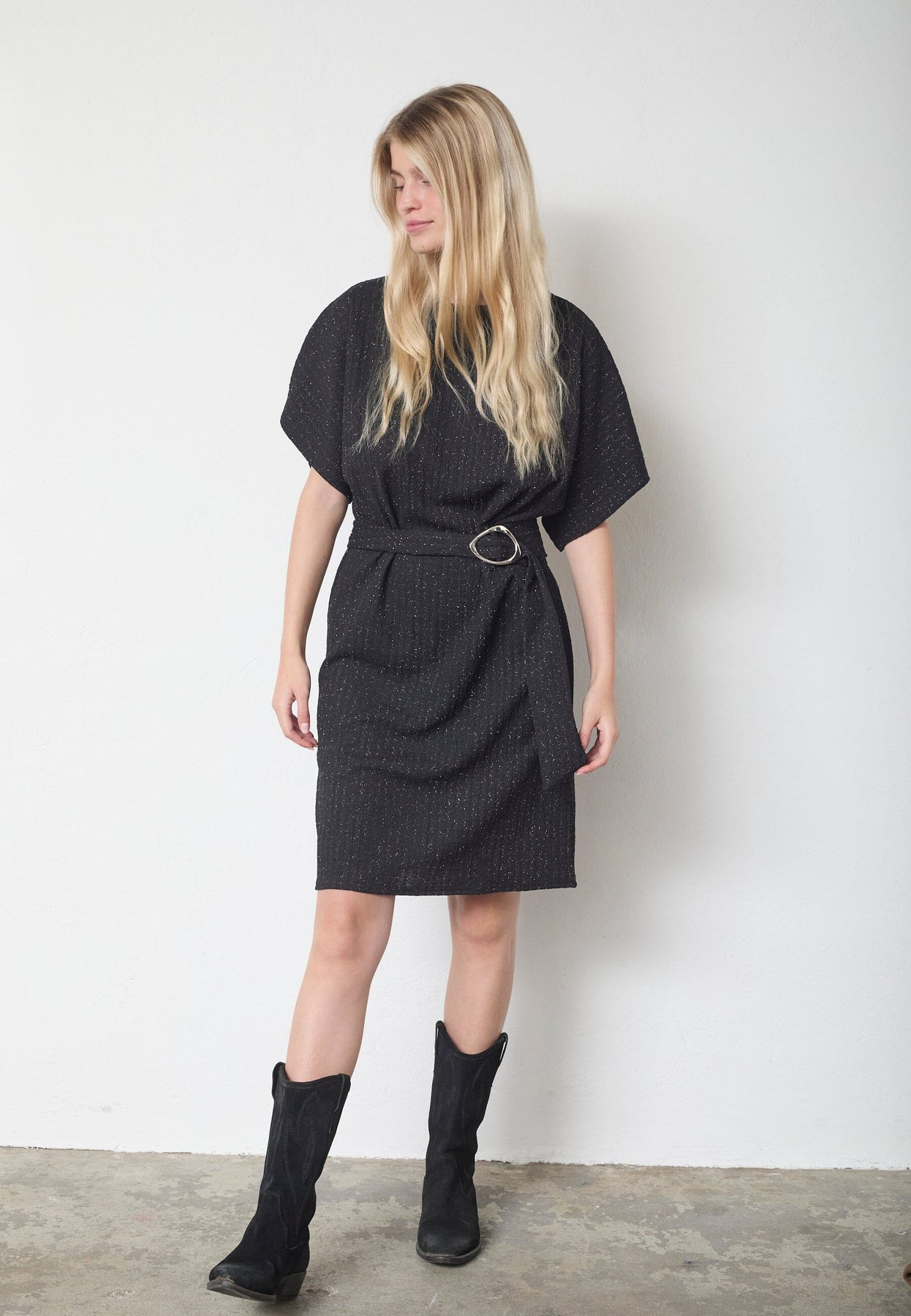 Sort kjole fra Sisters Point med sølvfargede tråder. Kjolen har korte flaggermusermer, rund halsutringning og lårkort lengde. Den har en løs passform og et medfølgende belte.