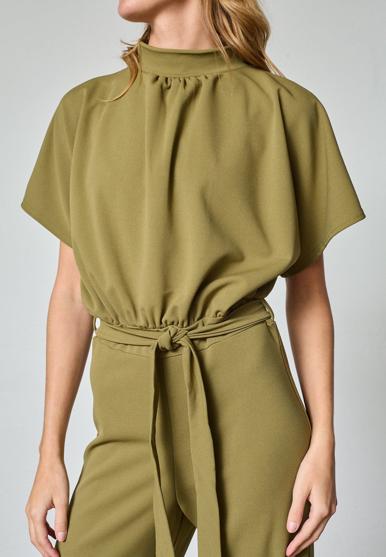 Jumpsuit fra Sisters Point i en khakigrønn farge. Materialet er 95% polyester og 5% elastan, og jumpsuiten har en løs passform med gulvlengde.