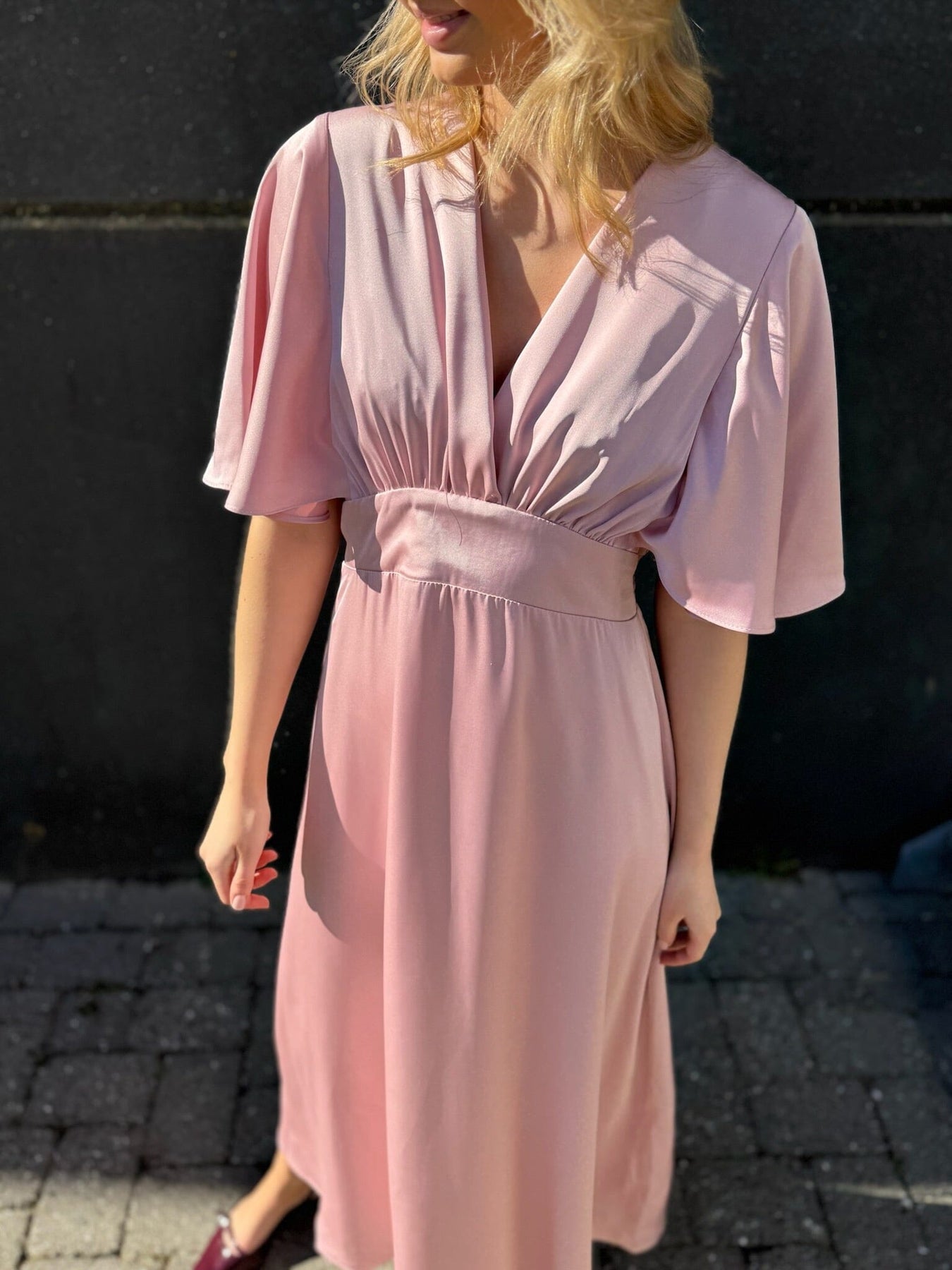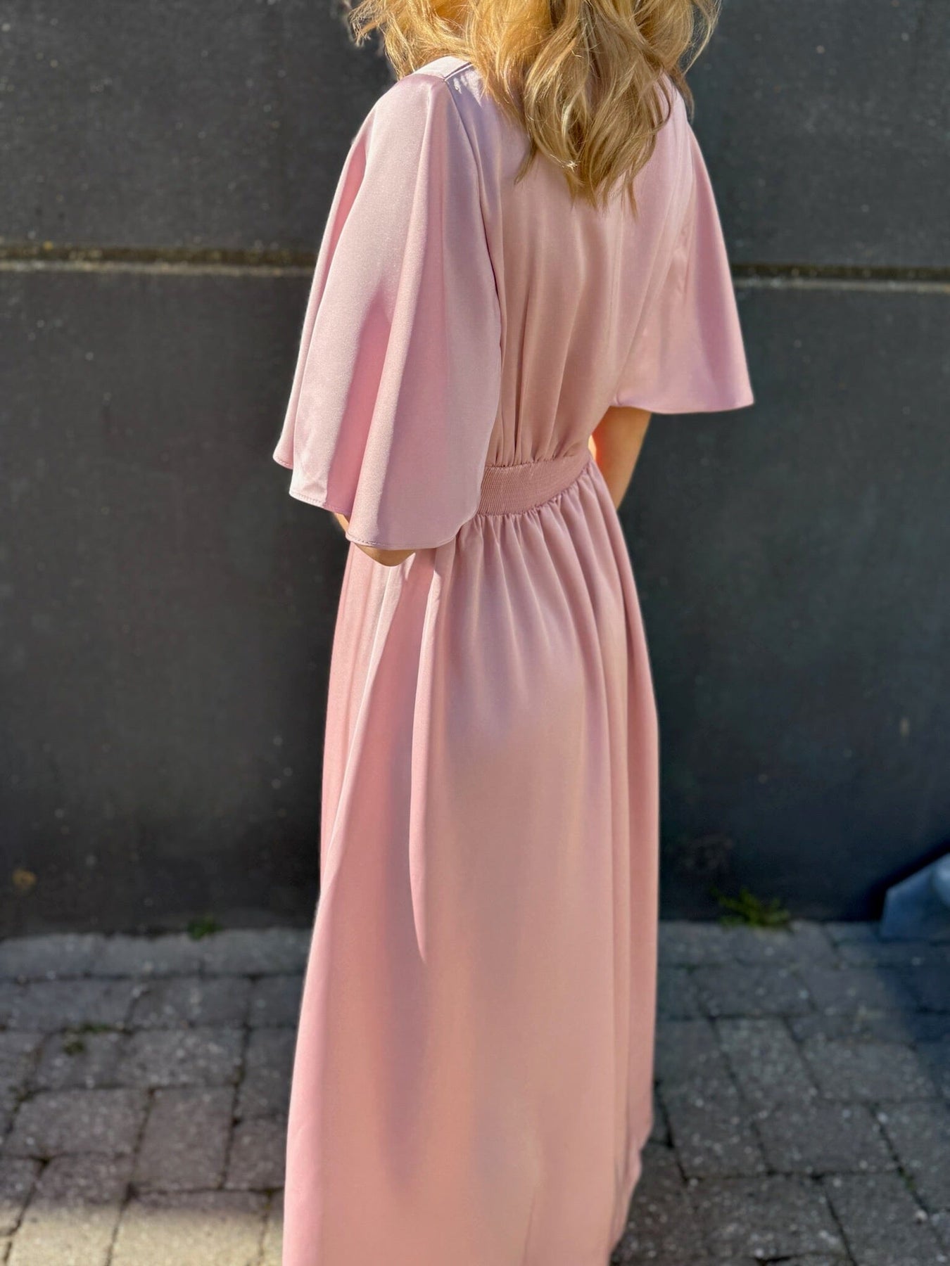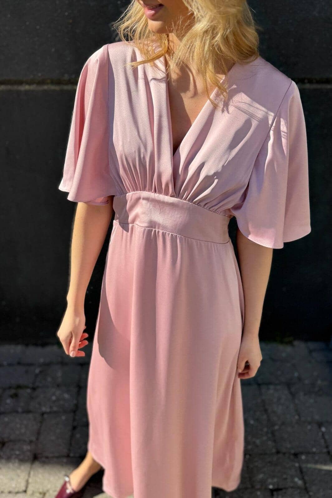 Rosa kjole fra Sisters Point med v-utringning og smock på ryggen. Kjolen har brede 3/4-ermer og volangdetaljer som gir den et feminint uttrykk.
