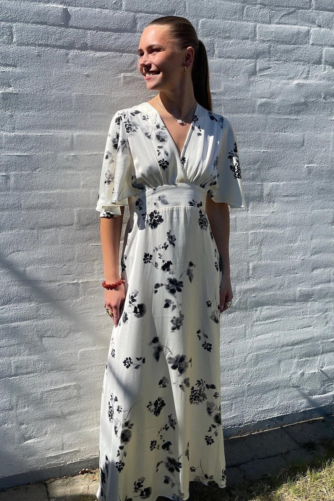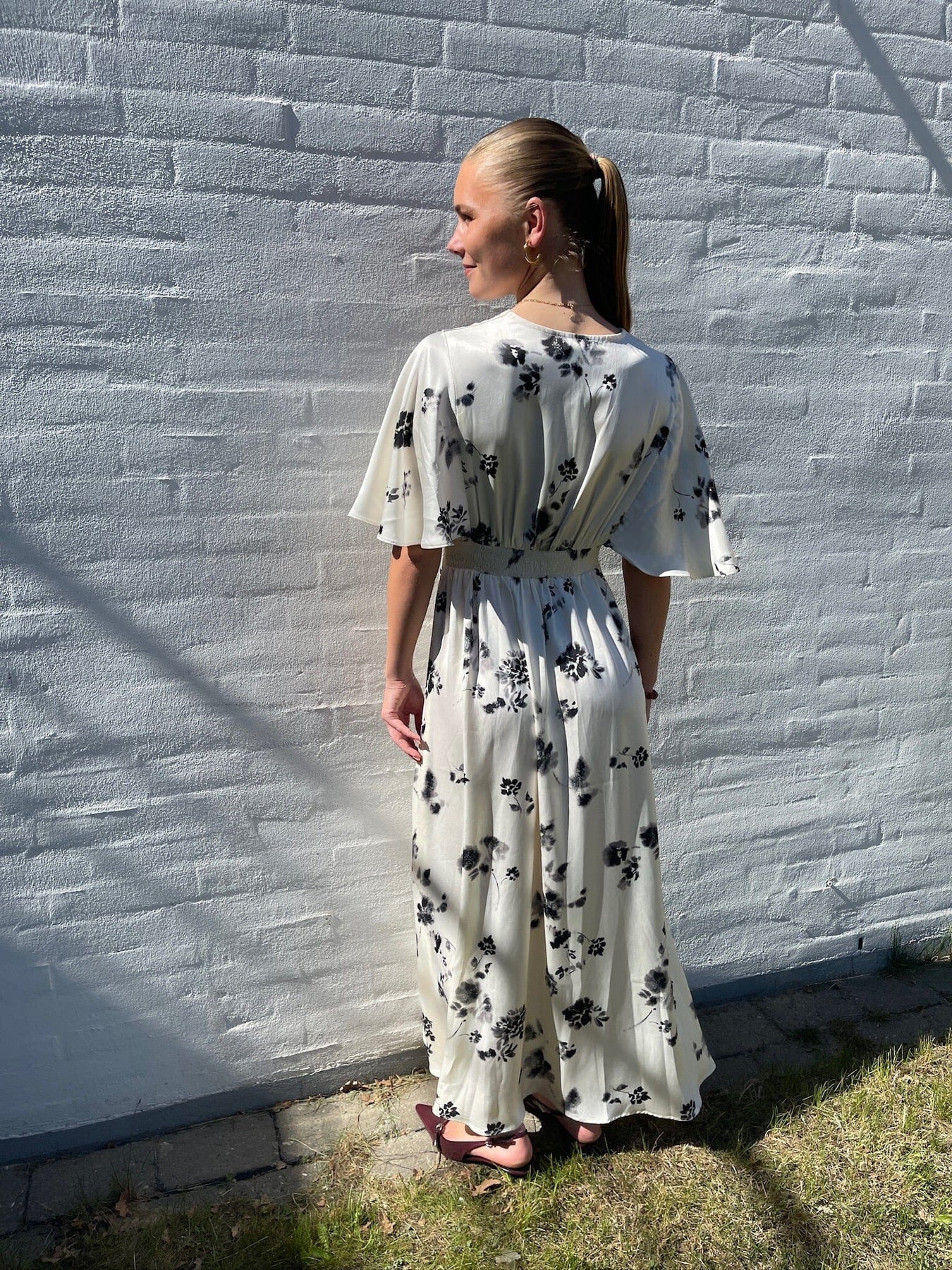 Ankellang kjole fra Sisters Point i krem med svarte blomster. Kjolen har v-halsutskjæring og korte fladderærmer. Den smockede midjen gir en god passform.