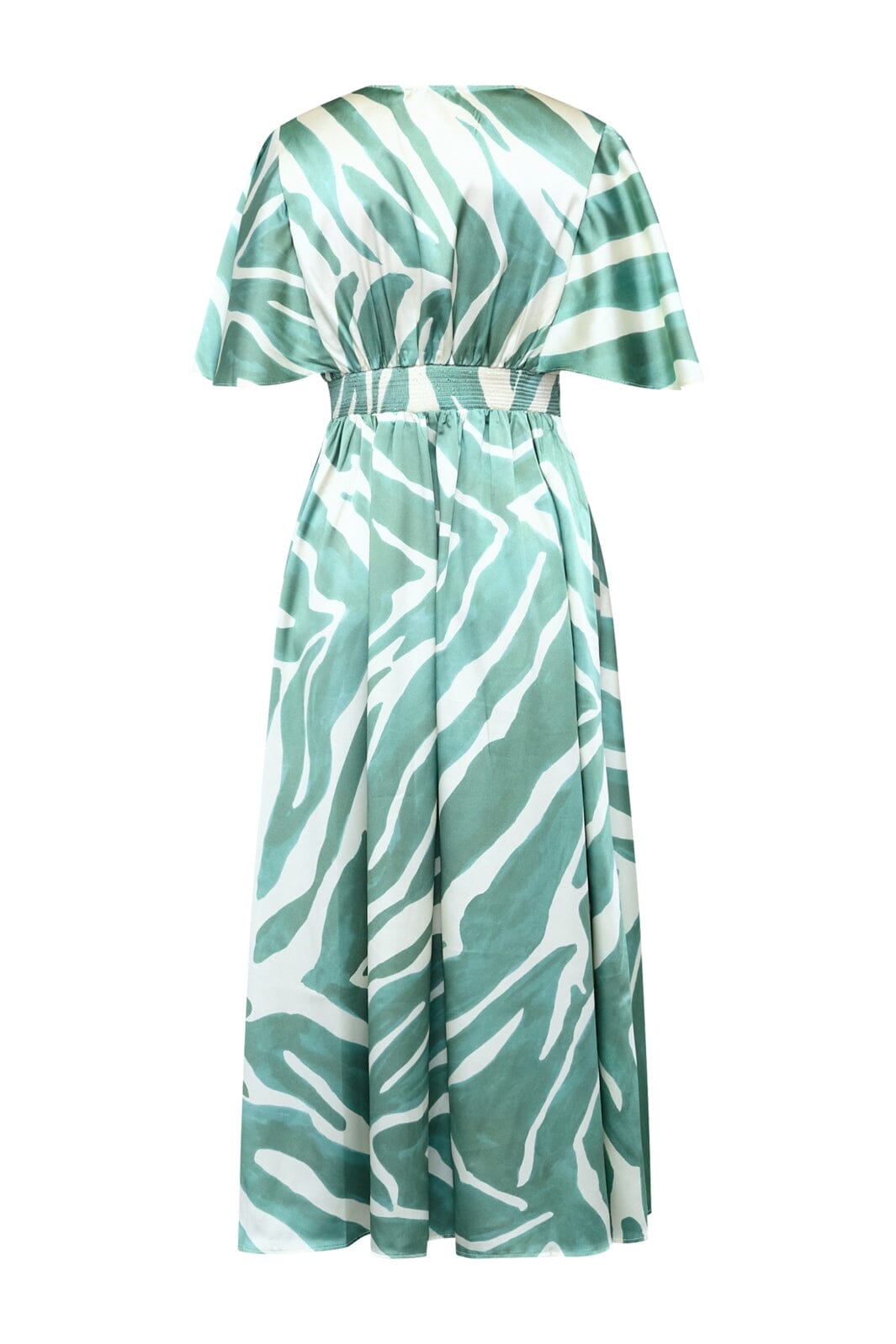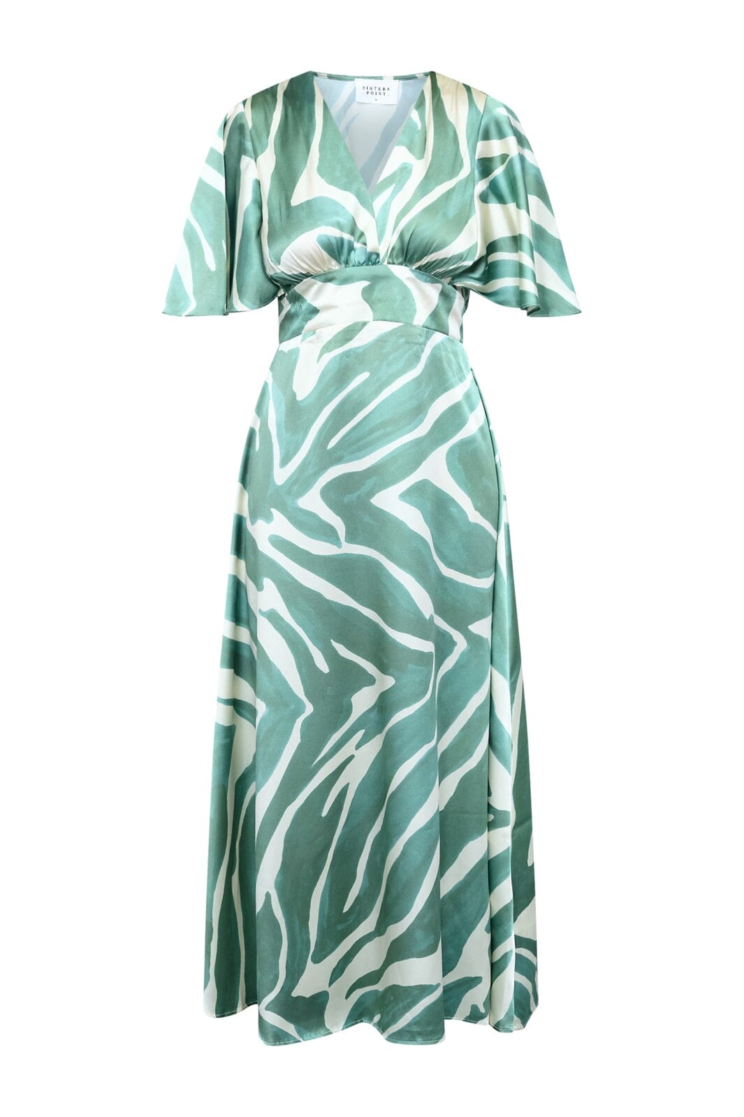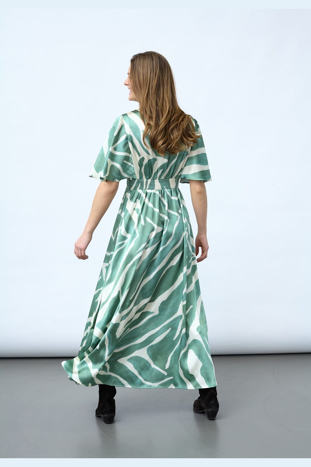 Kjole fra Sisters Point med et grønt og hvitt grafisk mønster. Kjolen har ankellengde, korte ermer og V-hals.