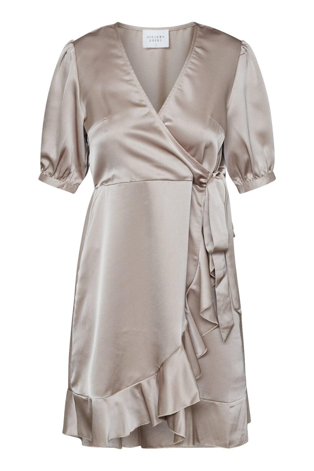Slå-om-kjole fra Sisters Point i champagnefarget satinlignende stoff. Kjolen har pufsermer, volangkant nederst og et bindebånd i siden som skaper en fin silhuett.